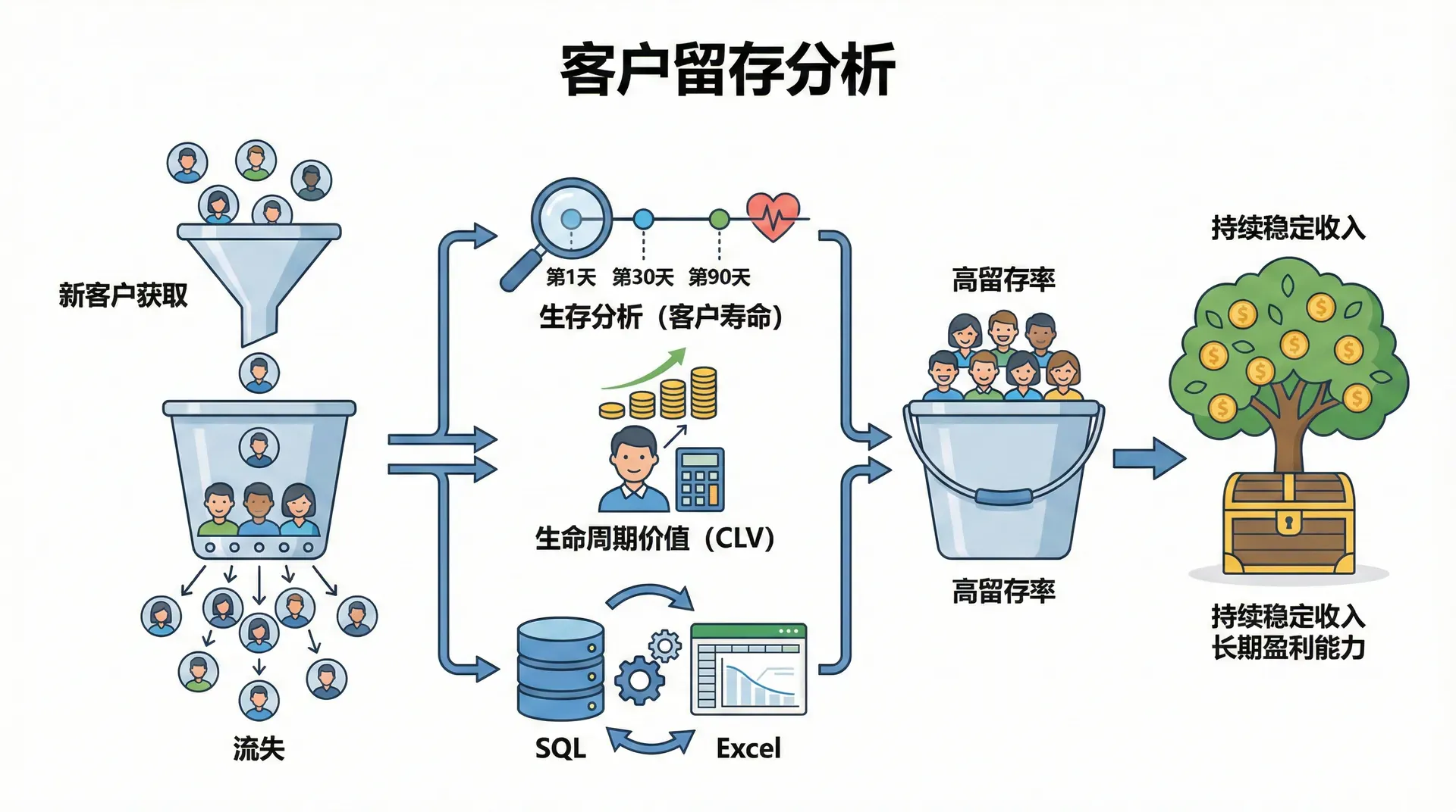 在商业分析中,获取新客户固然重要,但留住现有客户往往更加关键。客户留存率直接影响企业的长期盈利能力,一个高留存率的客户群体能够为企业带来持续稳定的收入。 在这一节课中,我们将学习如何进行客户留存分析,使用生存分析的方法来理解客户的“寿命”,计算客户生命周期价值,并通过SQL和Excel来模拟和可视化客户的留存情况,发现影响客户留存的关键因素。