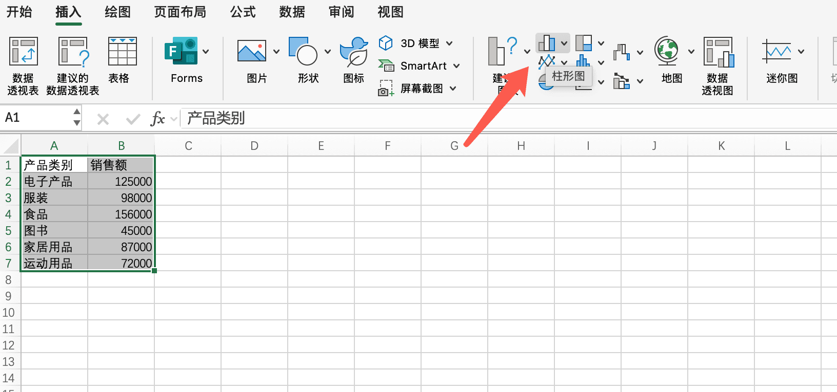 假设我们已经将产品类别的销售数据导入到Excel中。要创建柱状图,我们首先选中数据区域,包括类别名称和对应的销售额。然后,在"插入"选项卡中选择"柱状图",Excel会自动生成图表。