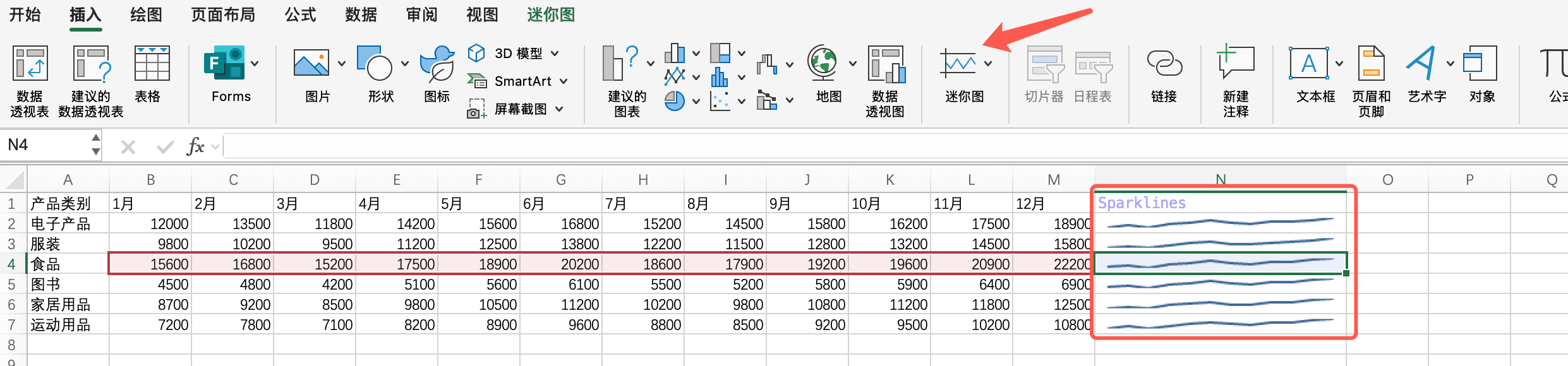 假设我们有一个包含每个月销售额的表格。我们可以在表格旁边添加一列,使用Sparklines来显示每个产品类别的销售趋势。这样,我们既能看到具体的数据,又能看到趋势,一举两得。