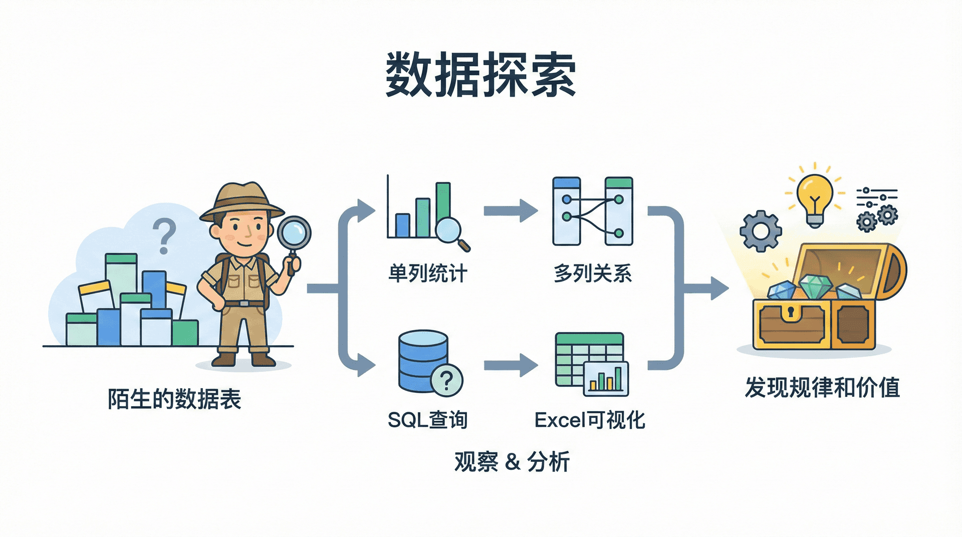 当我们面对一张陌生的数据表时,第一个问题往往是"这张表里到底有什么?"。数据探索(Data Exploration)就像是探险家在未知领域中的第一次探索,我们需要仔细观察、仔细分析,才能发现数据中隐藏的规律和价值。 这一节课,我们将学习如何系统地探索数据,从单列的基本统计到多列之间的关系,从SQL查询到Excel可视化,逐步建立起对数据的全面理解。