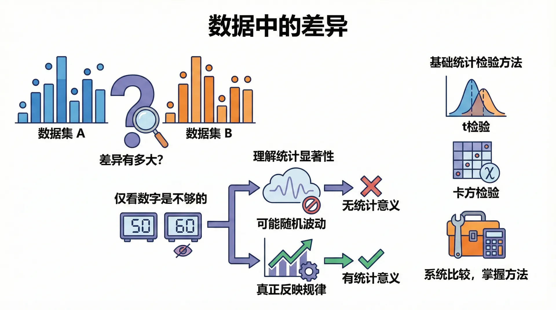 在数据分析中,我们经常需要回答一个问题:"这两个数据集之间的差异有多大?"这个问题看似简单,但实际上涉及很多统计学的概念和方法。仅仅看到两个数字不同是不够的,我们需要判断这种差异是否具有统计意义,是否可能是随机波动导致的,还是真正反映了某种规律。 在这节课中,我们将学习如何系统地比较不同数据集,理解统计显著性的概念,并掌握一些基础的统计检验方法。