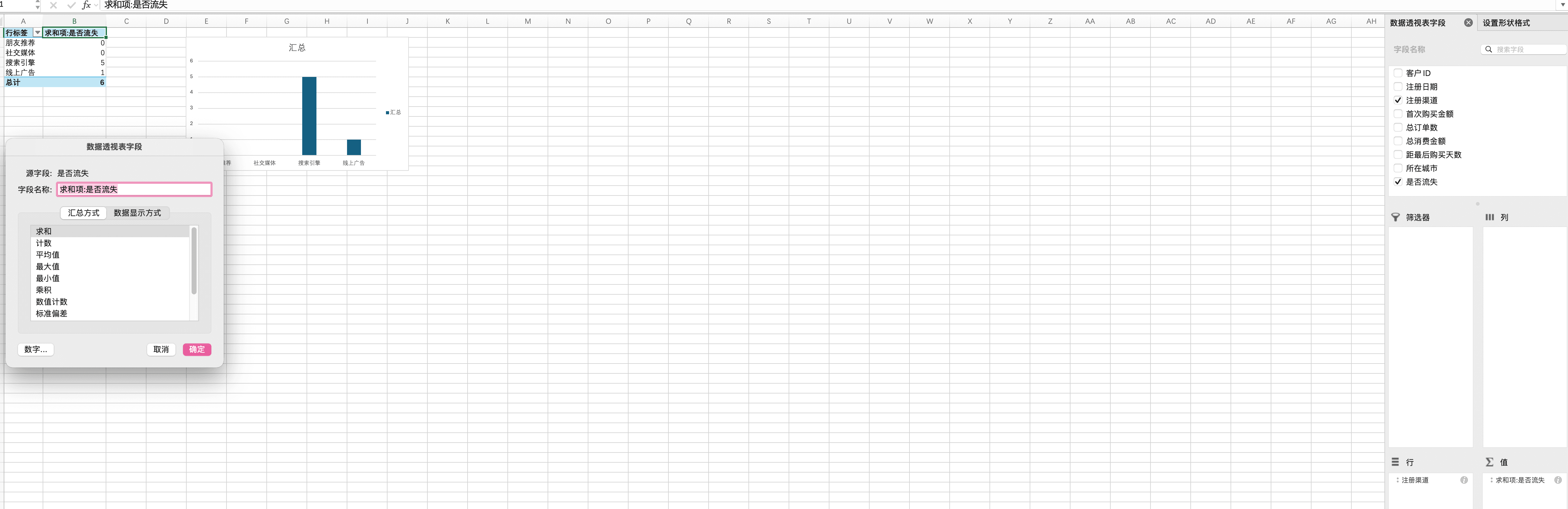 在数据透视表字段列表中,我们将"注册渠道"字段拖到"行"区域,将"是否流失"字段拖到"值"区域。默认情况下,Excel会对"是否流失"求和,我们需要修改计算方式。我们点击"值"区域中的"是否流失"下拉菜单,选择"值字段设置",将计算方式改为"平均值"。这样,我们就能看到每个注册渠道对应的平均流失率(也就是流失率),1减去这个值就是留存率。