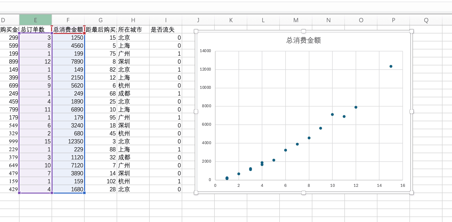 为了根据是否流失来设置不同的颜色,我们需要将数据分成两组:流失客户和留存客户。我们可以先筛选数据,只显示流失客户(是否流失=1),选中这些点的总消费金额和总订单数,创建散点图,并将这些点设置为红色。然后,我们再添加留存客户的数据系列(是否流失=0),将这些点设置为蓝色。
