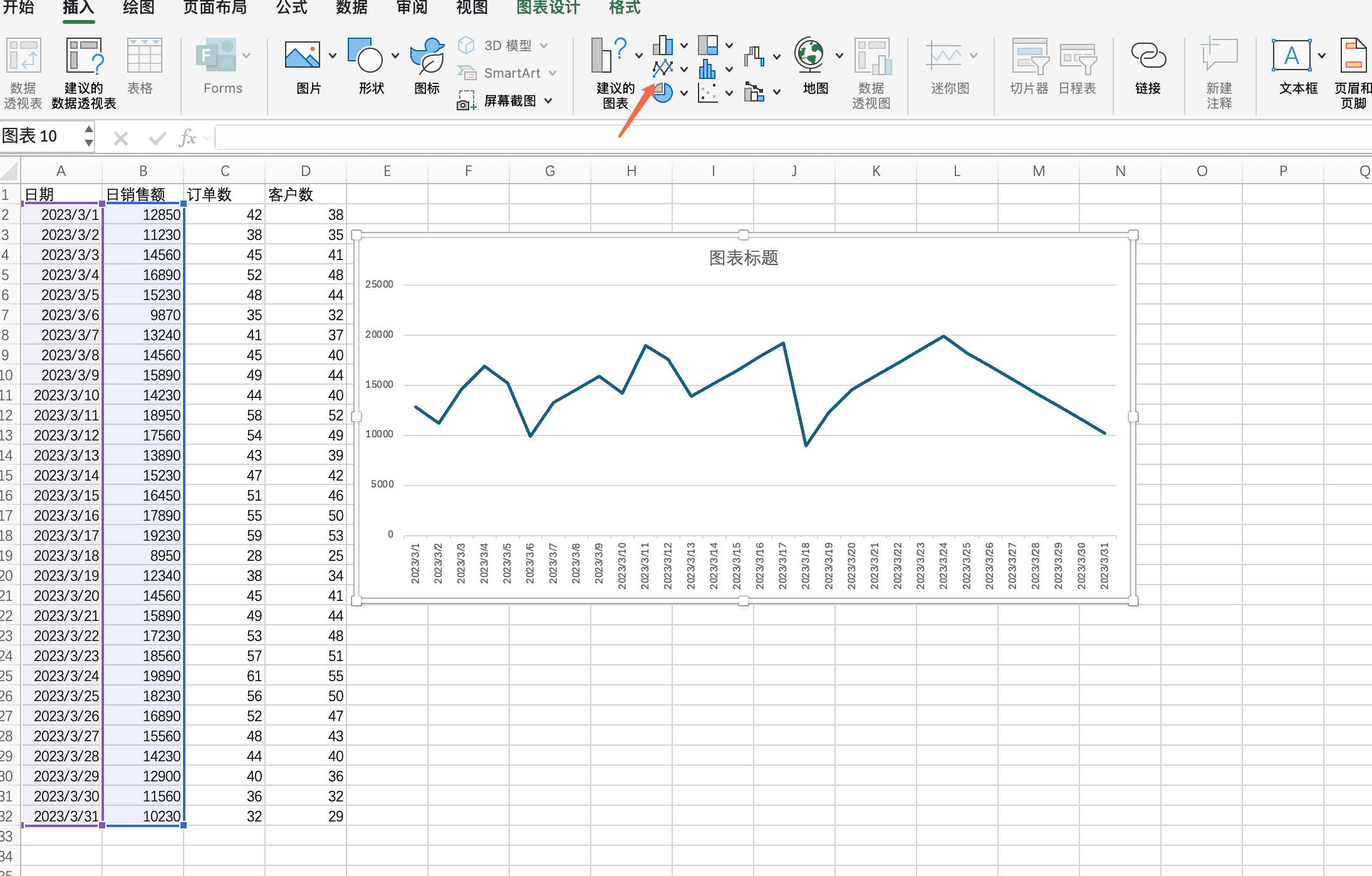 选中包含日期和日销售额的两列数据(A列和B列),创建折线图后,我们会看到一条随时间变化的曲线。这条曲线能够清晰地展示销售额的波动趋势,比如我们可以看到3月4日、11日、17日、24日(都是周末)的销售额明显高于其他日期,这反映了周末消费的特点。