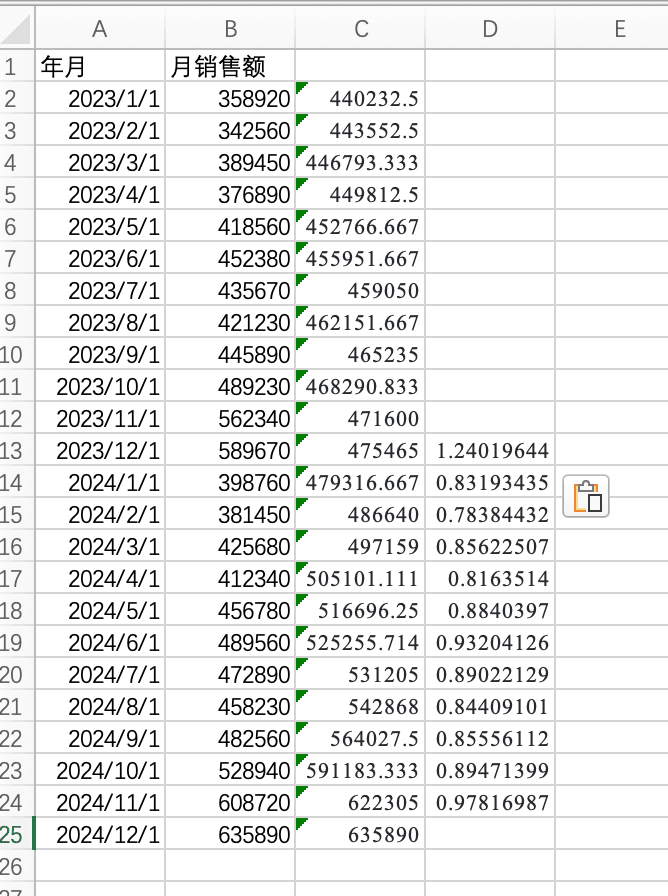 然后将这个公式向下拖动到D24单元格。季节性指数是原始值与移动平均的比值,它反映了季节性因素。