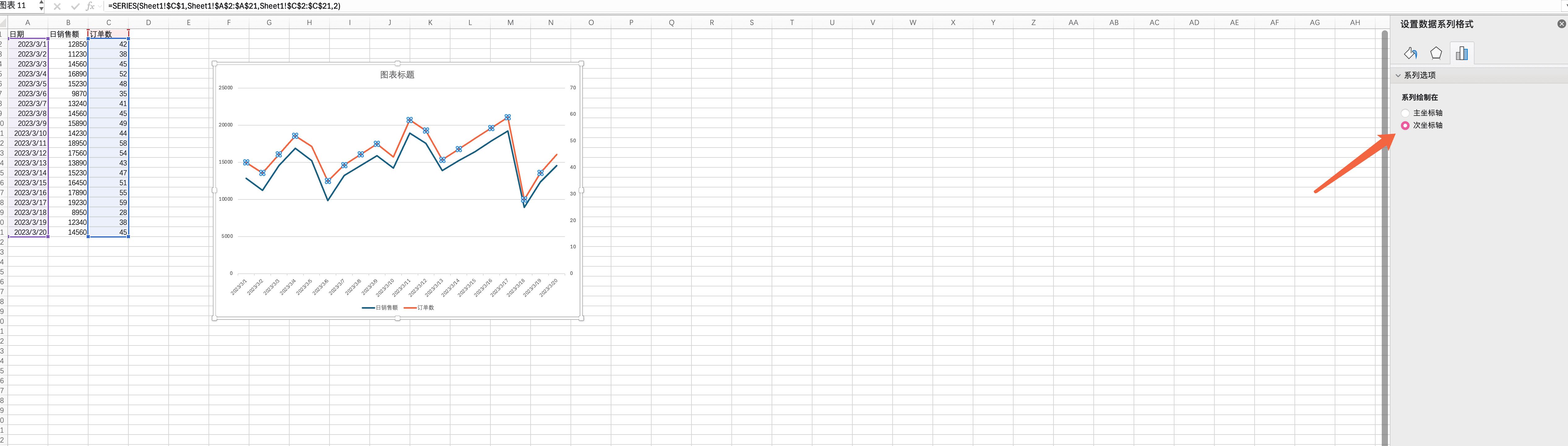 这时候,我们可以使用组合图表,为不同的指标使用不同的纵轴。在Excel中,我们右键点击"订单数"这条线,选择"设置数据系列格式",然后选择"次坐标轴"。这样,"订单数"系列就会使用右侧的纵轴,而"日销售额"系列继续使用左侧的纵轴。