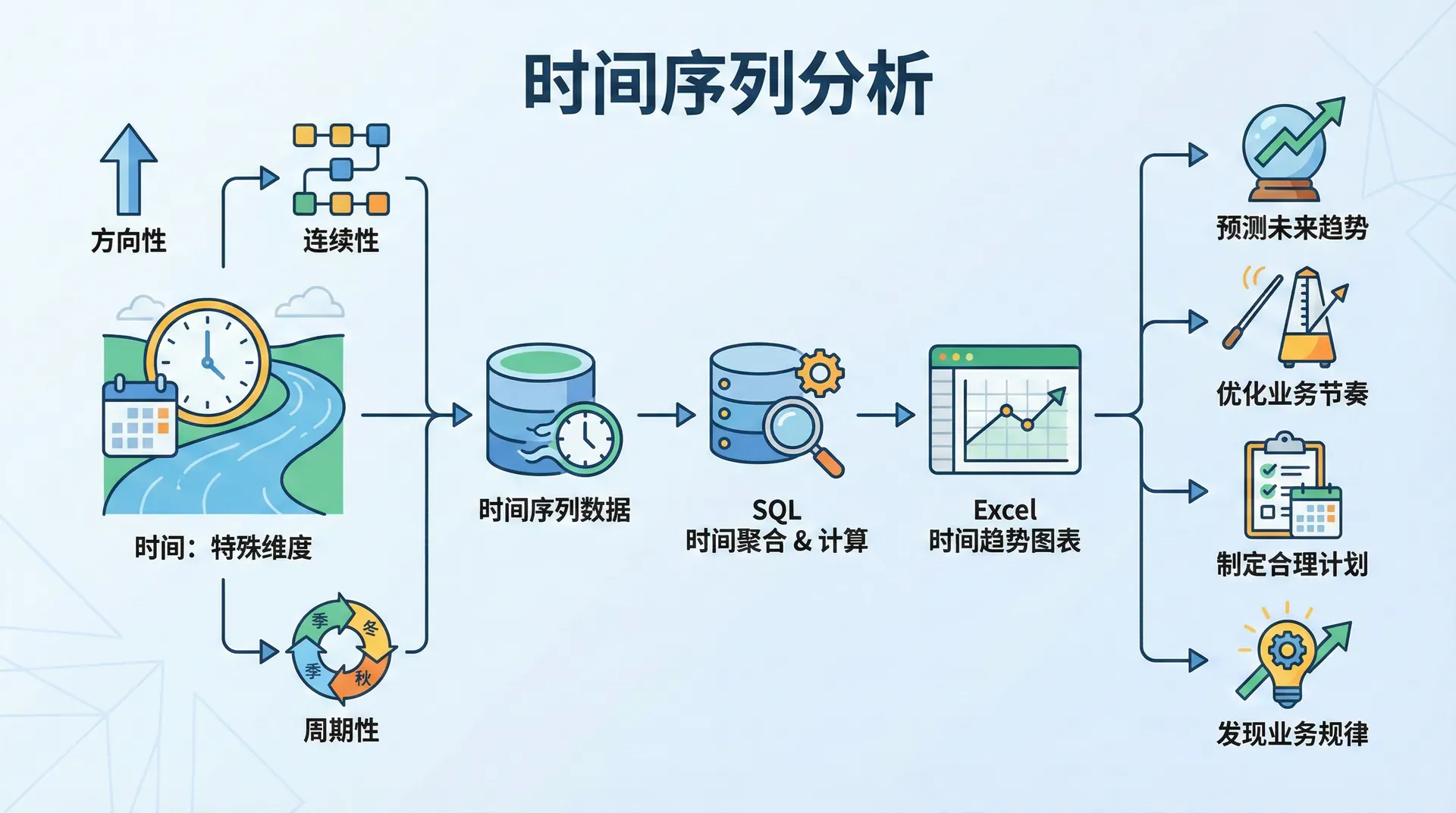 时间在商业分析中是一个特殊的维度。与地理位置、产品类别等维度不同,时间具有方向性、连续性和周期性。理解时间序列数据的特征,识别业务中的时间规律,能够帮助我们预测未来趋势、优化业务节奏、制定更合理的计划。 这节课我们将学习如何处理和分析时间序列数据,使用SQL进行时间维度的聚合和计算,并通过Excel创建直观的时间趋势图表,发现隐藏在时间背后的业务规律。