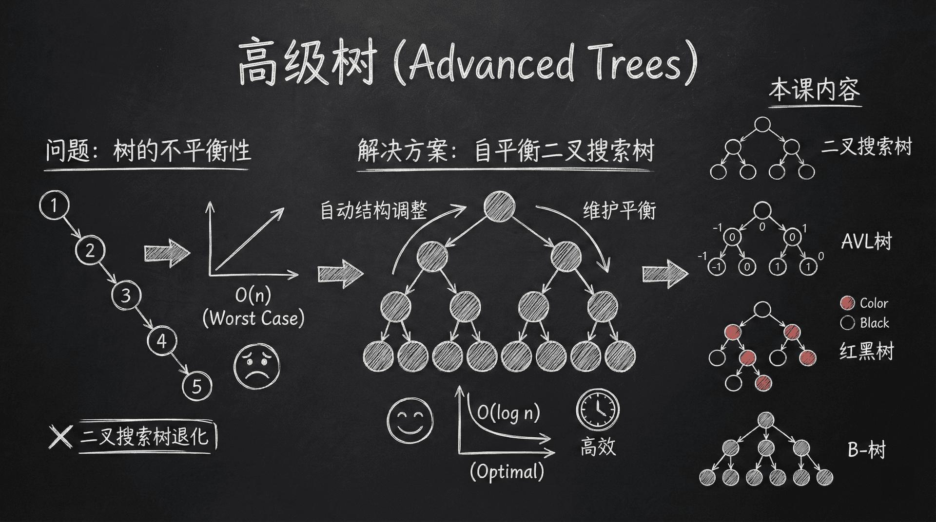 这节课,我们将系统学习四种重要的自平衡树结构:二叉搜索树(作为基础)、AVL树、红黑树和B-树,深入理解它们的设计原理、平衡维护机制以及在不同应用场景下的性能特征。