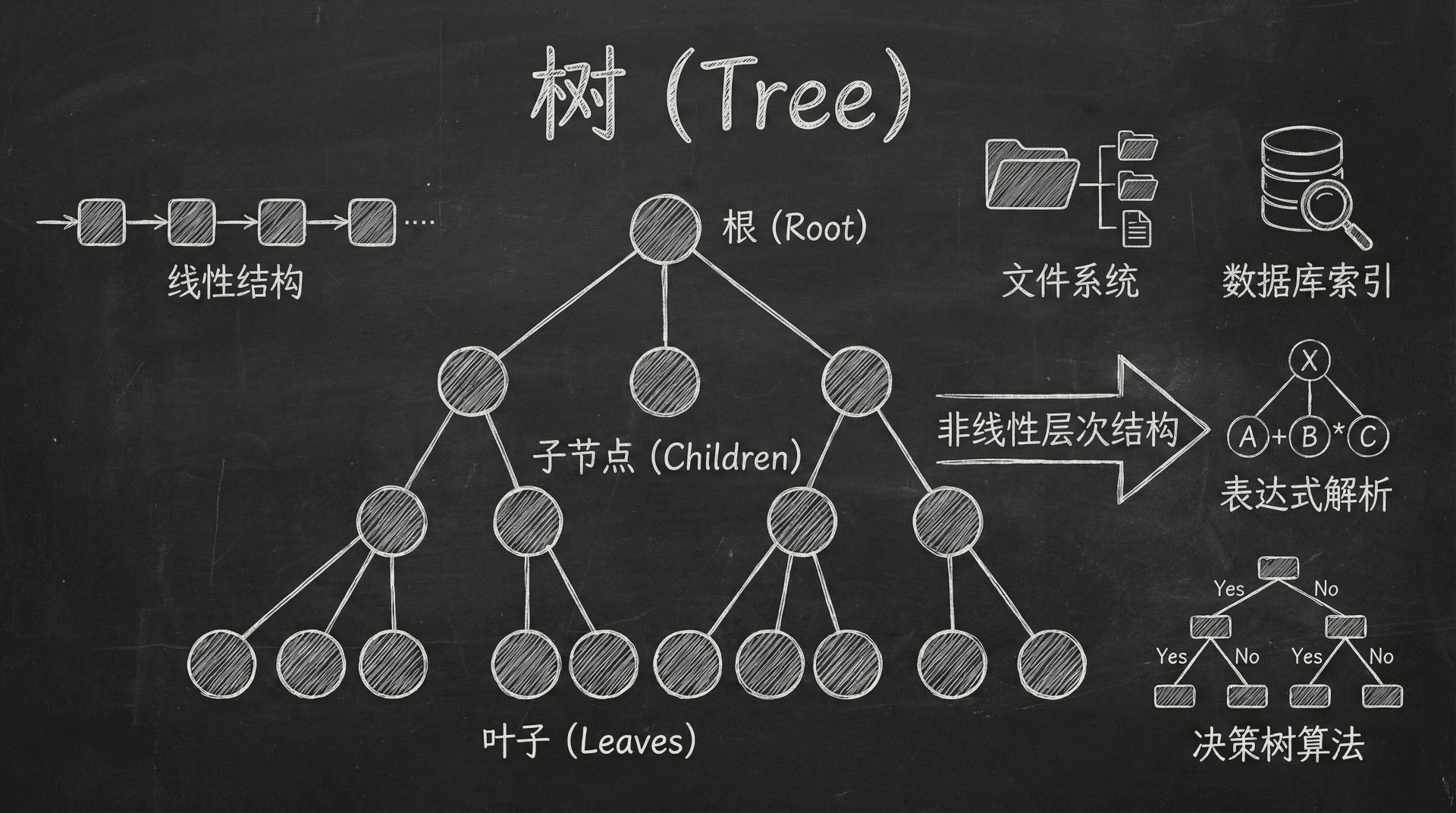 树(Tree) 是一种重要的非线性数据结构,用于表示具有层次关系的数据集合。树结构在计算机科学中应用广泛,包括文件系统、数据库索引、表达式解析、决策树算法等领域。