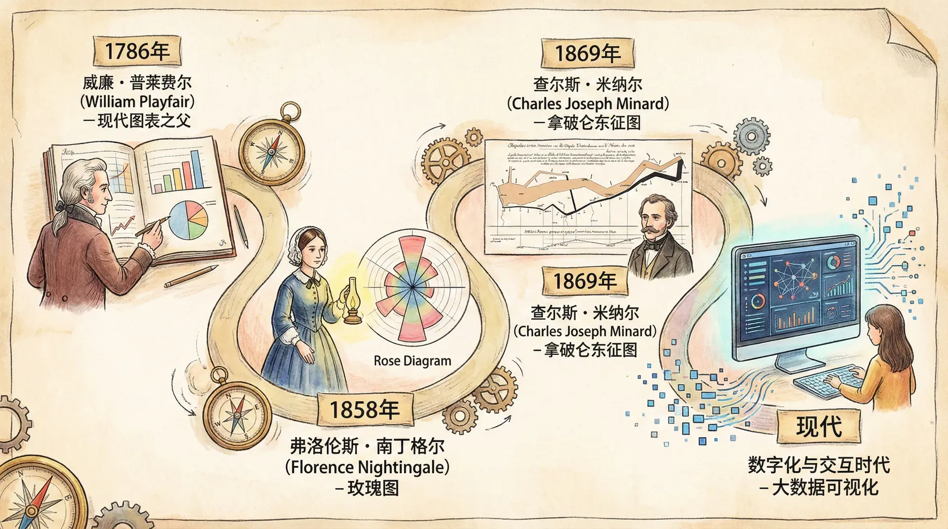 18世纪和19世纪是数据可视化的萌芽期。这个时期出现了许多具有里程碑意义的可视化作品。1786年,苏格兰工程师威廉·普莱费尔(William Playfair)出版了《商业与政治图解》,其中首次使用了折线图、柱状图和饼图。这些图表类型至今仍然是我们最常用的可视化形式。普莱费尔被誉为“统计图形学之父”,他的贡献奠定了现代数据可视化的基础。