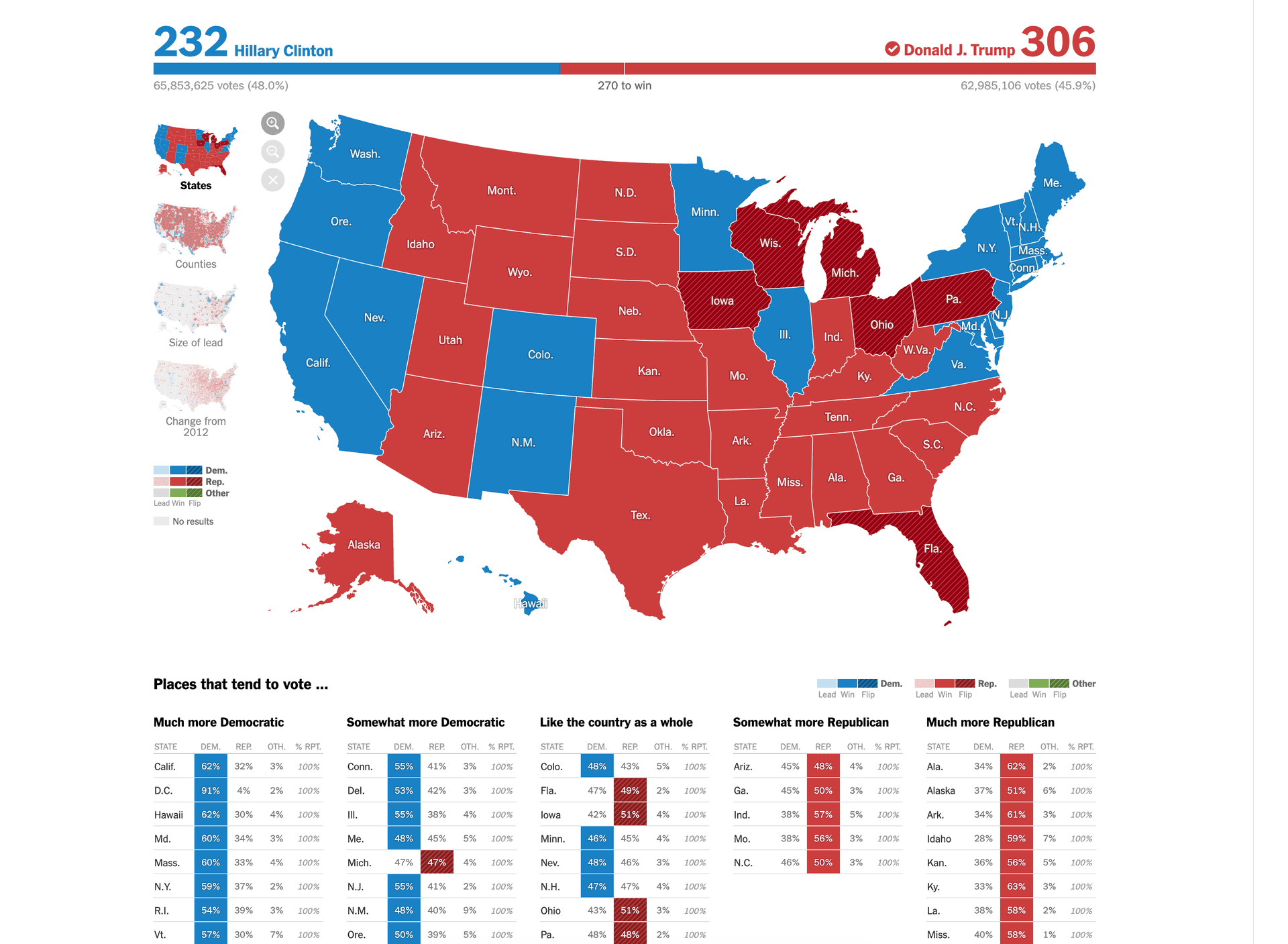 在2012年美国总统选举期间,纽约时报制作了一个交互式选举地图。这个地图不仅展示了各州的投票结果,还通过颜色深浅来表示支持率的差异,通过动画来展示投票结果的实时更新过程。