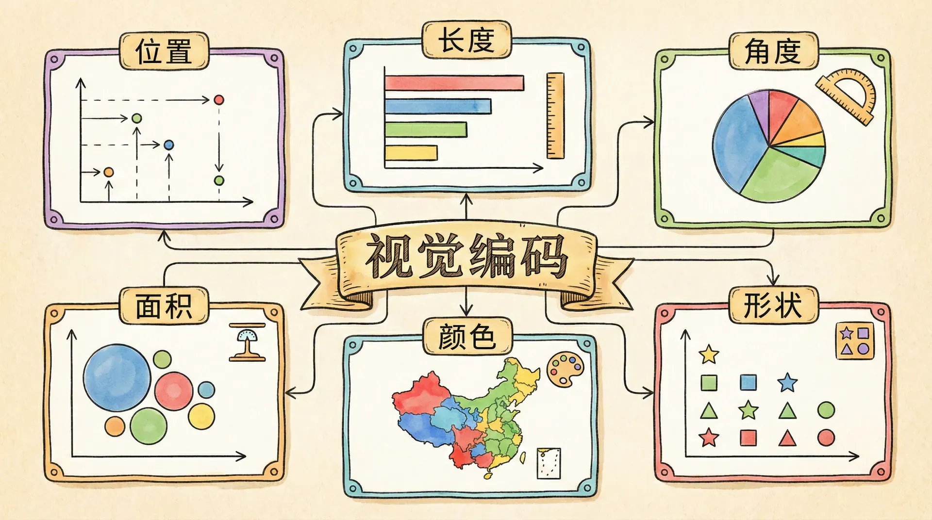 位置是最精确的视觉通道。人类视觉系统对位置的感知非常准确,我们能够精确地比较两个元素的位置关系。在数据可视化中,位置编码是最常用的编码方式之一。