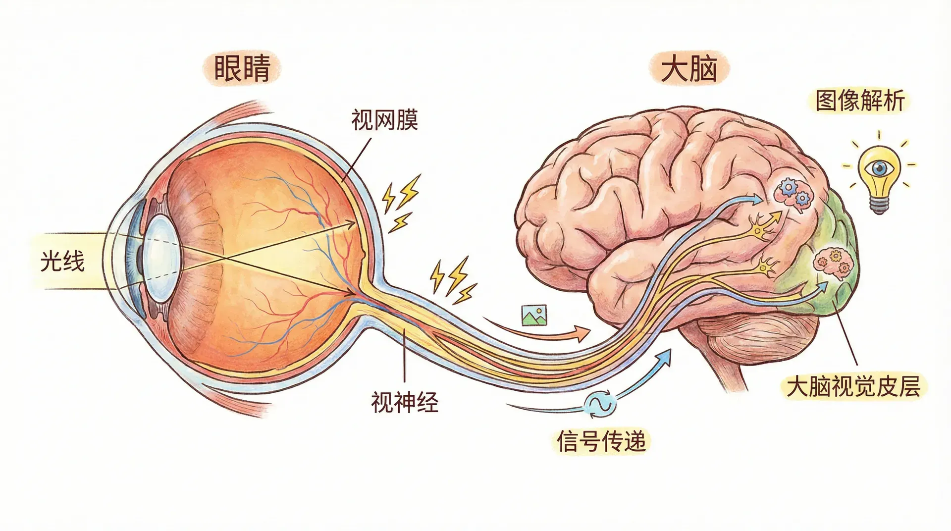 人眼是一个复杂的光学系统。光线通过角膜和晶状体的折射,在视网膜上形成倒立的图像。视网膜上有两种感光细胞:视杆细胞和视锥细胞。视杆细胞对光线非常敏感,主要负责在暗光环境下的视觉,但不能分辨颜色。视锥细胞对颜色敏感,主要负责在明亮环境下的视觉和颜色识别。