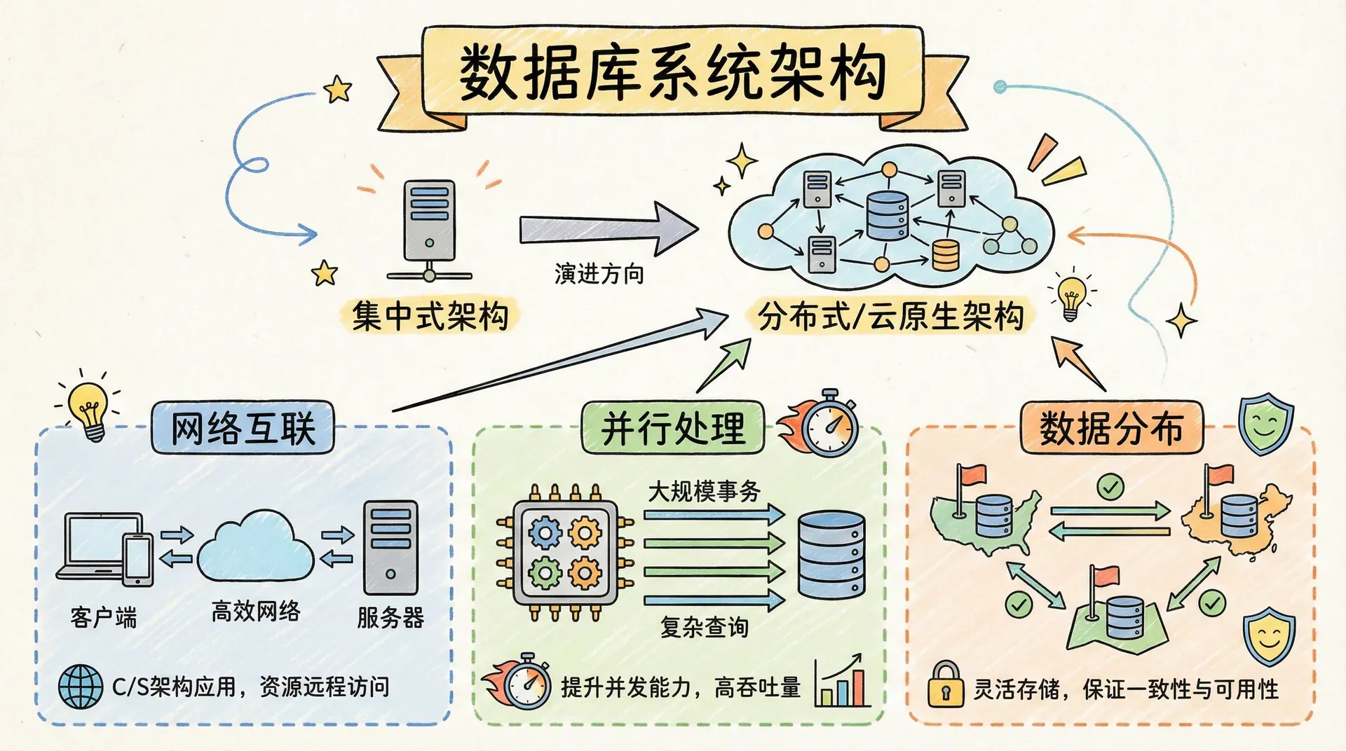 数据库系统架构的演进反映了计算技术的发展历程。从最初的集中式系统到现代的云原生分布式架构,每种架构都有其适用场景和技术特点。