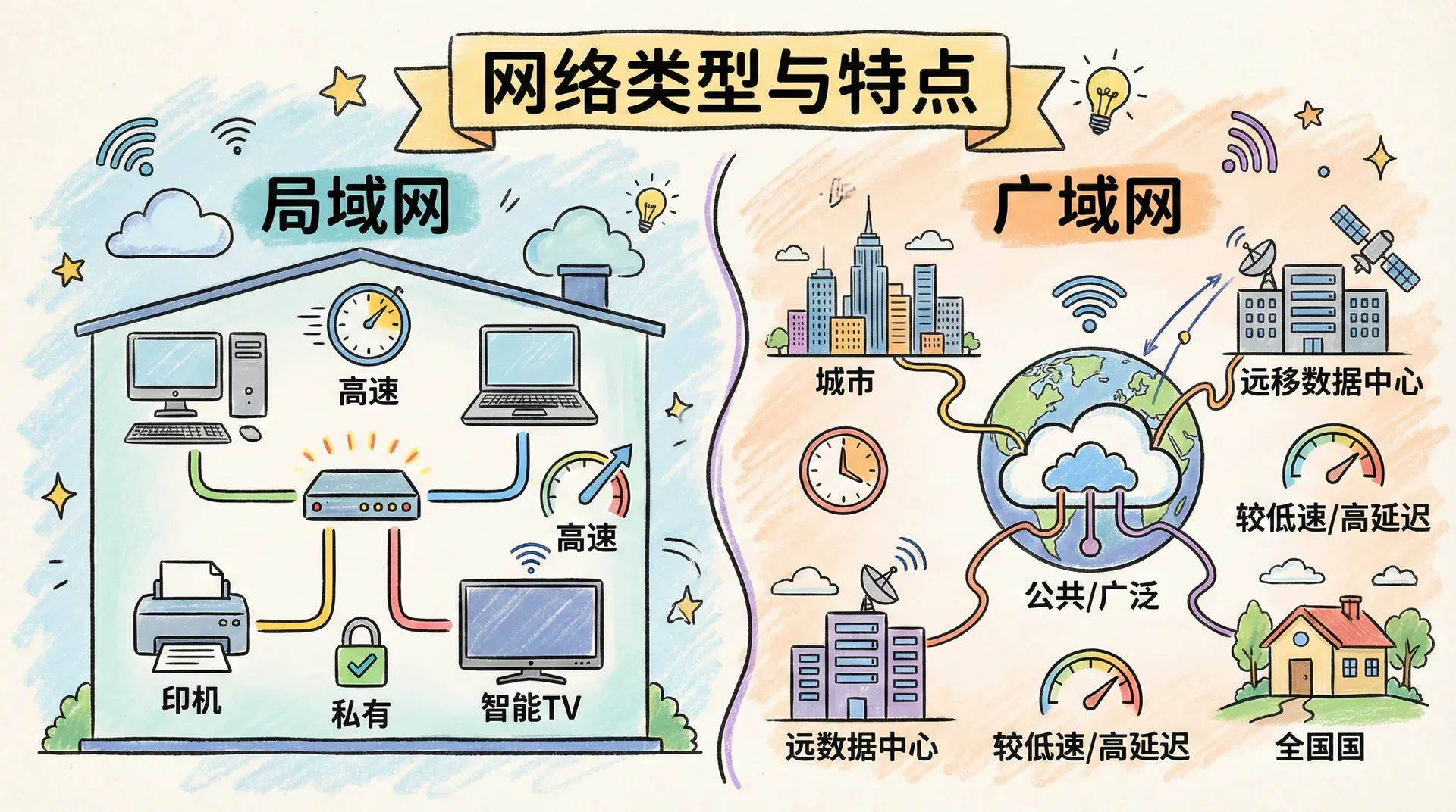 与局域网相比,广域网不仅受限于带宽约束,更面临明显的通信时延(通常为数十到数百毫秒),其原因包括地理距离带来的光传播延迟以及多级路由器转发和队列缓冲所引入的排队时延。 广域网可进一步细分为以下两类: