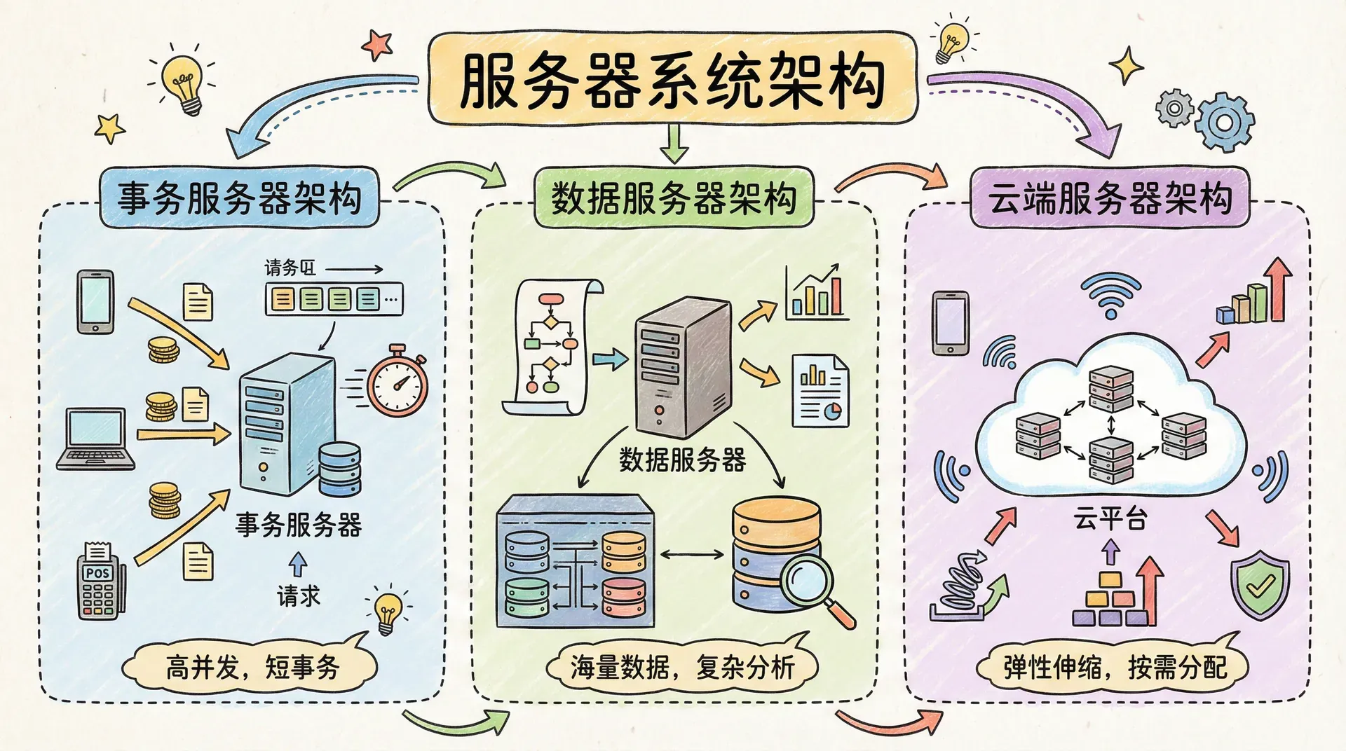 服务器系统可以大致分为两大类:事务服务器和数据服务器。选择哪种架构主要取决于应用的特点和性能需求。
