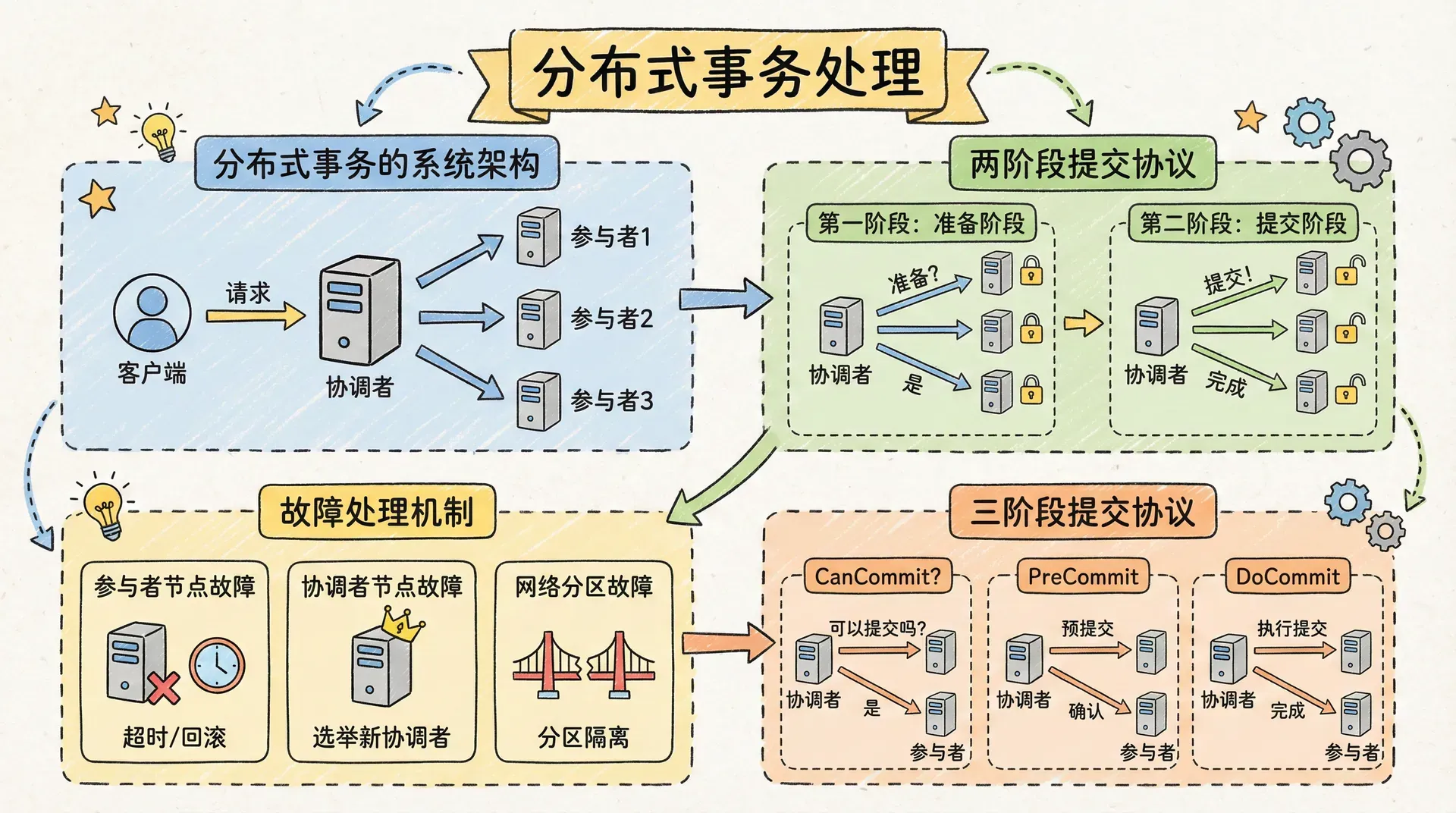 在分布式系统中,故障的出现是不可避免的。两阶段提交(2PC)协议设计时,需要充分考虑多种异常场景,确保系统的事务一致性和可恢复性。
