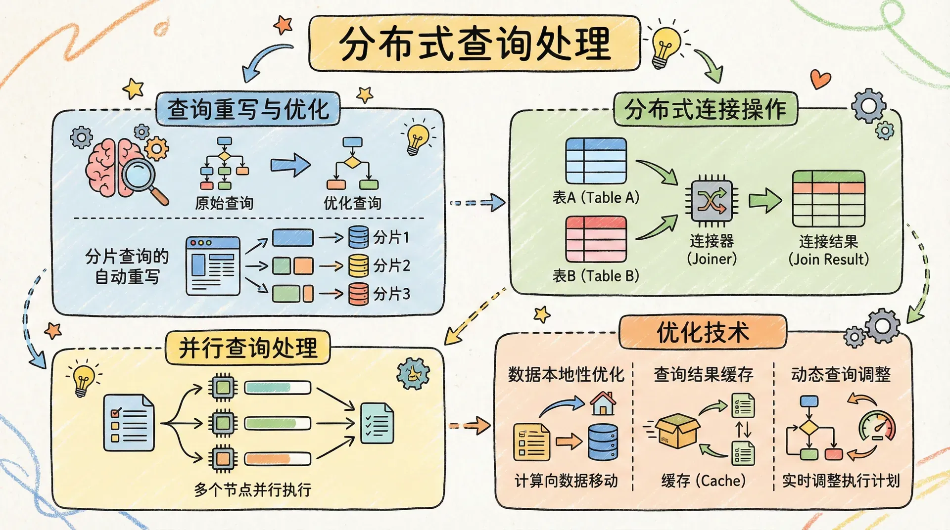 在分布式数据库中,查询处理变得更加复杂,因为数据可能分布在多个节点上。系统需要智能地决定如何获取和组合来自不同节点的数据,以最小的成本提供查询结果。