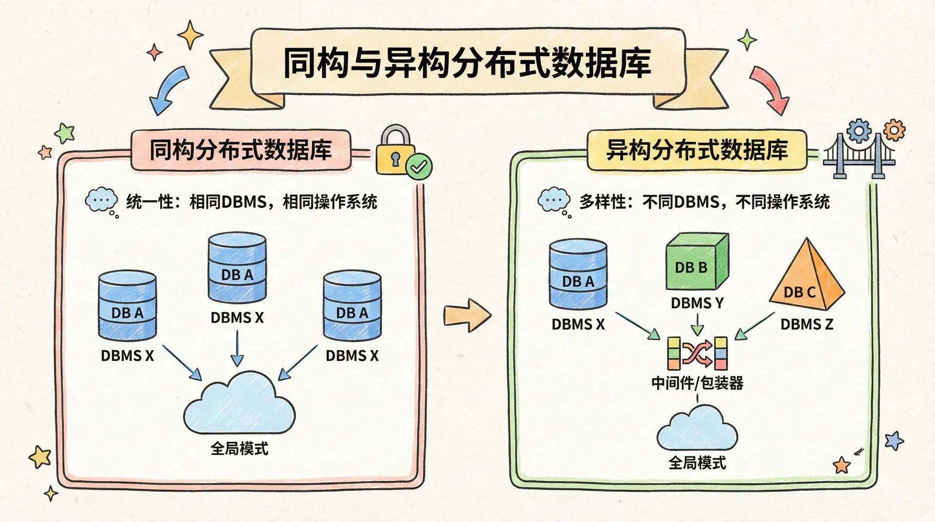 异构分布式数据库则更像是一个购物中心里的不同商户。服装店使用自己的进销存系统,餐厅使用点餐和结账系统,电影院使用票务系统。这些系统各不相同,但购物中心的管理方希望统一管理所有商户的营业数据。