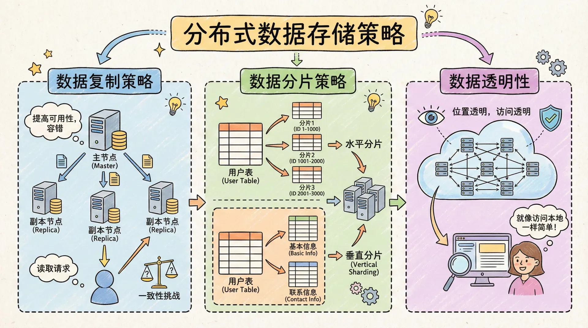 无论采用哪种数据分布策略,用户都不应该需要了解数据的物理存储位置。这种特性被称为数据透明性,它包括几个层面: