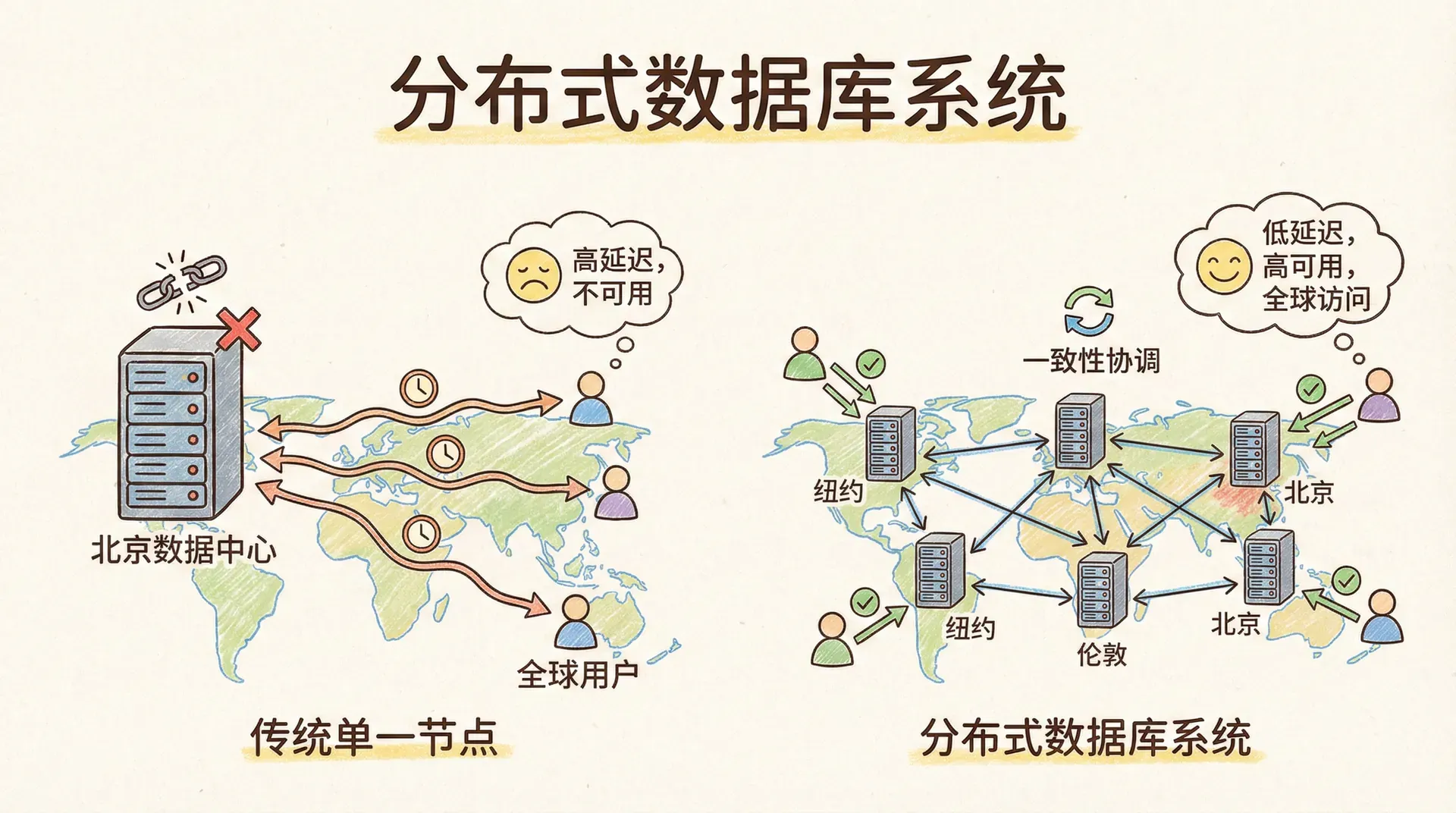 在当今全球化和高并发的业务需求下,传统单一节点的数据库方案已无法满足低延迟、高可用和弹性扩展的要求。以大型在线教育平台为例,若所有用户数据、课程信息及学习记录统一存放于单一地域的数据中心(例如北京),一旦该节点发生故障将导致系统整体不可用,同时地理分布用户访问时也会受到网络延迟影响,显著影响服务体验与业务连续性。