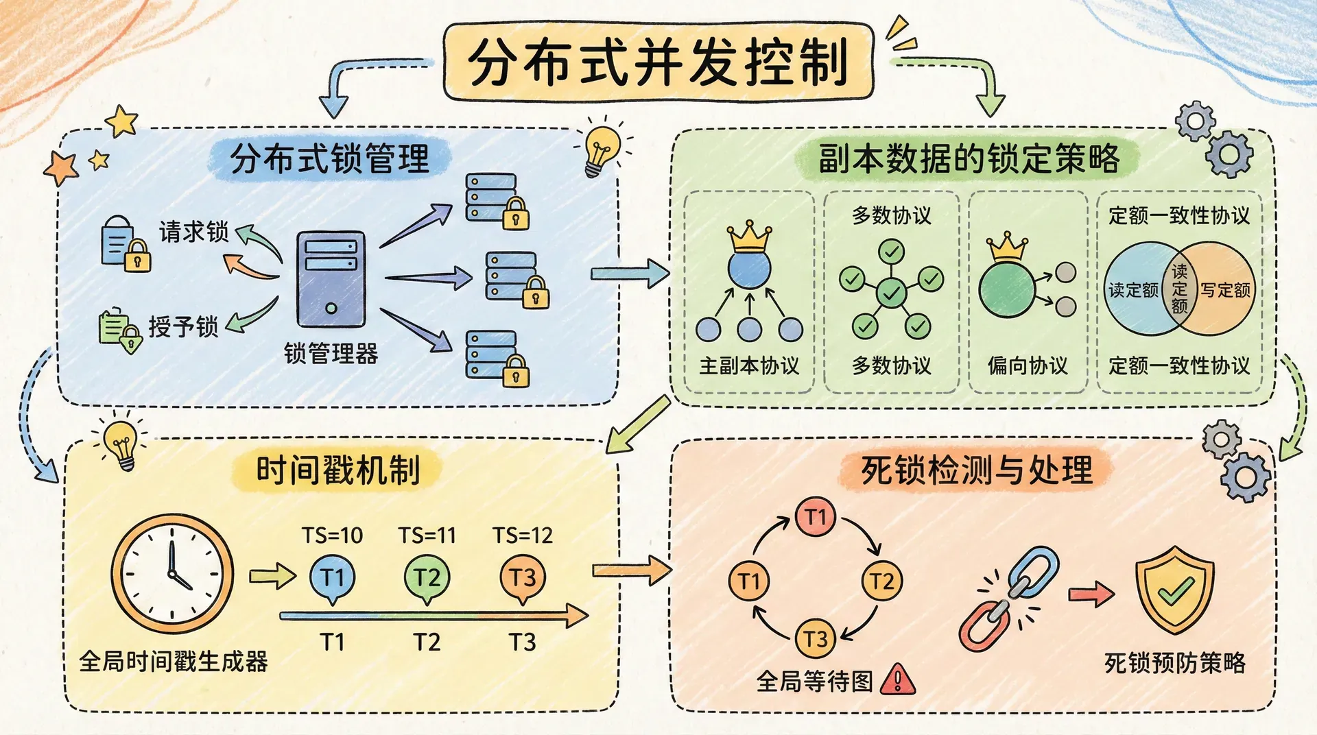 除基于锁的并发控制外,分布式数据库亦常采用时间戳机制协调全局并发。每个事务分配唯一时间戳,系统依据时间戳顺序裁决事务的冲突与调度,保证操作的串行等价性。