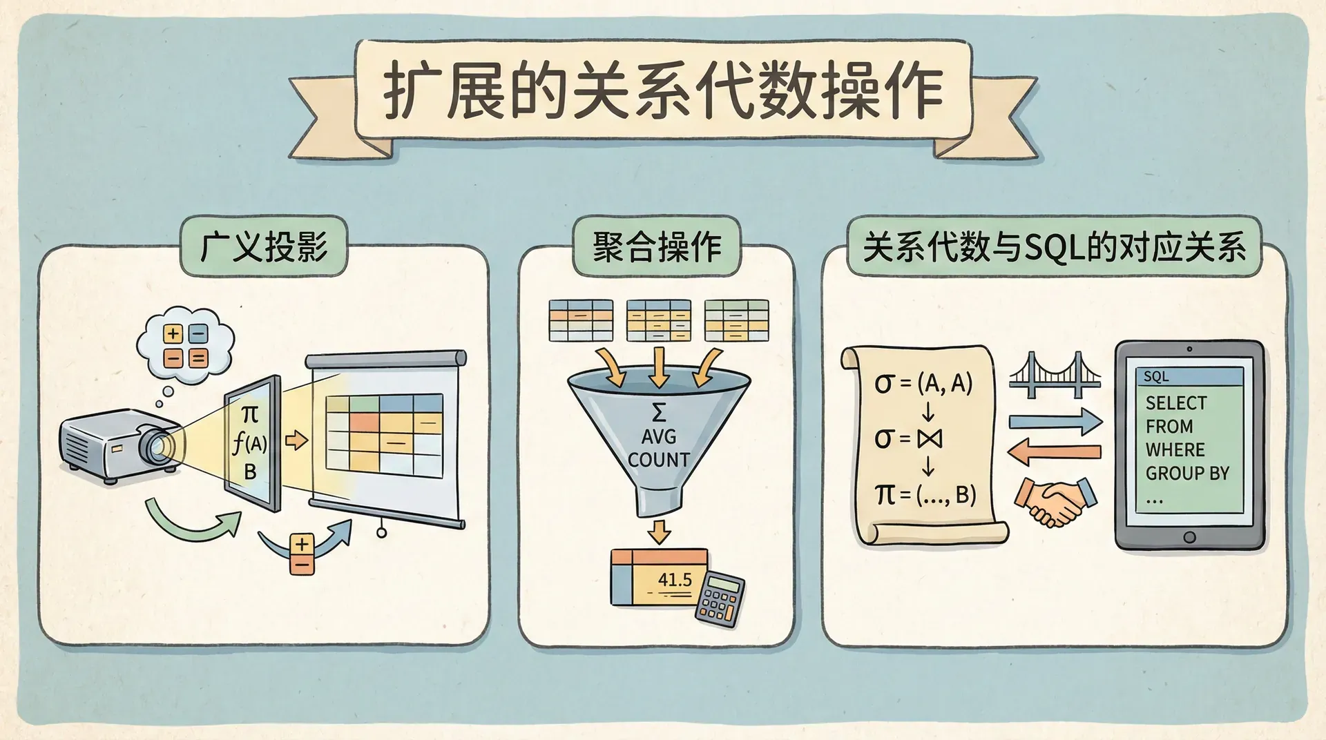 基础的关系代数操作已经具备了完备的表达能力(即任意关系查询均可通过其实现),但在实际数据库应用中,常常需要进行更为复杂的数据处理与分析操作,例如统计汇总、分组聚合及算术运算等。 为满足这些高级需求,关系代数引入了扩展操作,进一步增强了其在数据分析与决策支持场景下的实用性和表达能力。