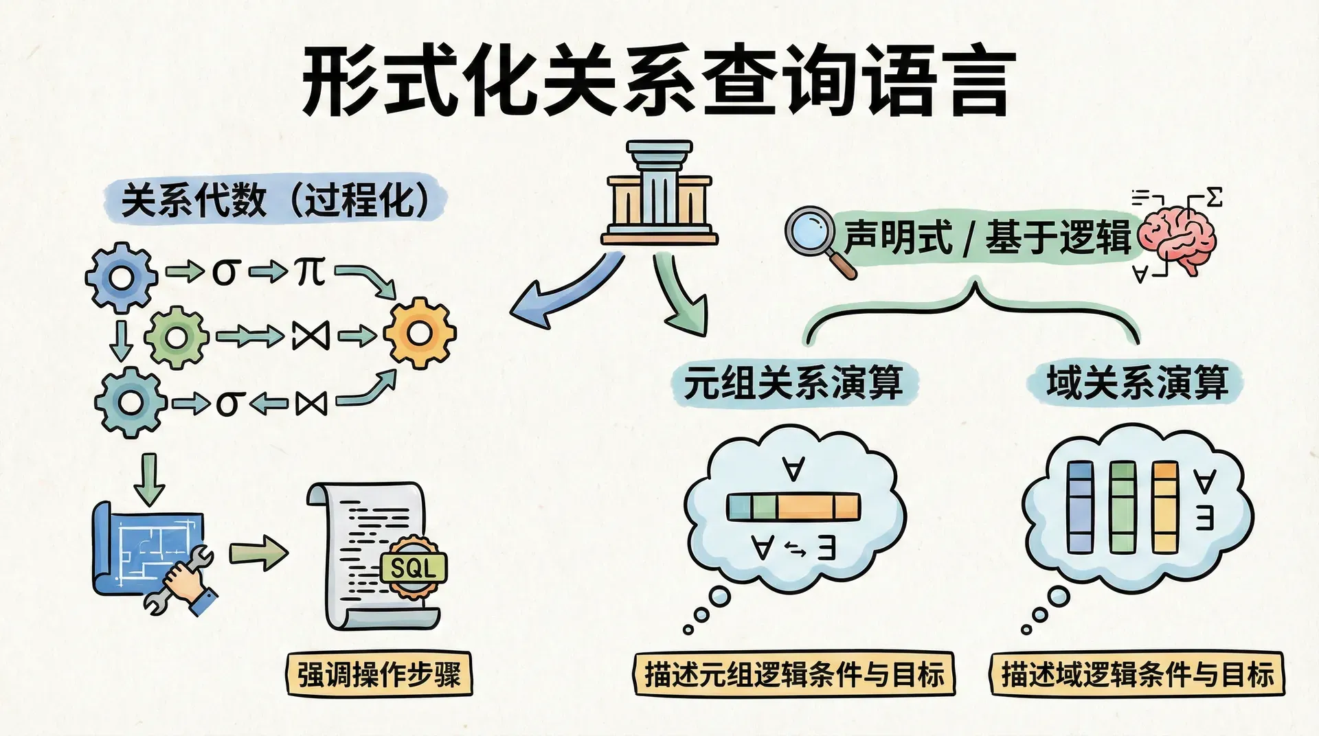 在前面的内容中,我们已经系统学习了关系模型及其对应的 SQL 查询语言。为了更深入地理解这些实际技术的理论基础,有必要掌握形式化关系查询语言。形式化查询语言为数据库查询操作提供了严谨的数学描述和分析框架,是数据库理论的核心组成部分。