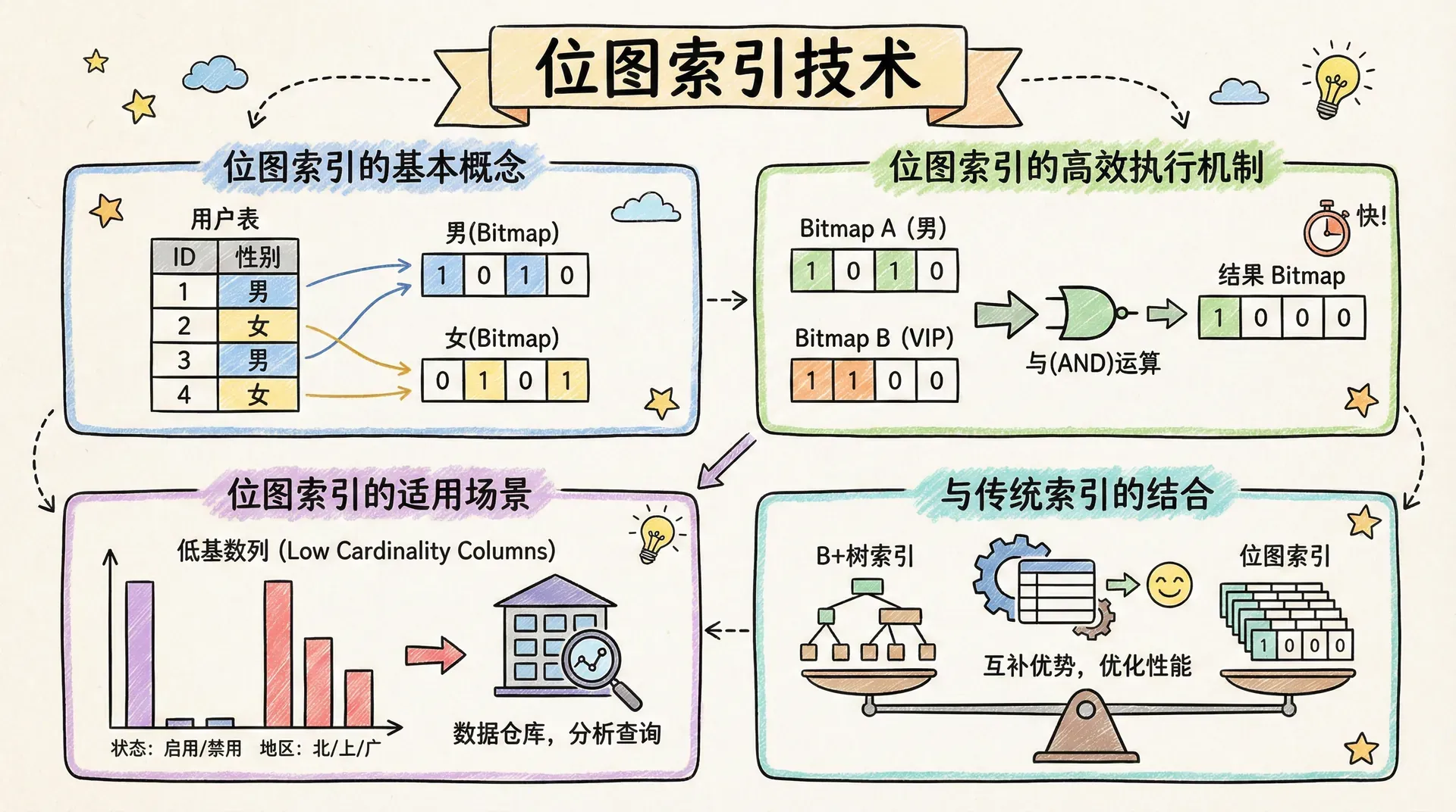 总体而言,位图索引虽存在适用范围限制,但在面向多维分析与大规模复杂查询场景时,具有不可替代的性能优势。伴随数据分析需求的持续增长,位图索引正在成为现代数据库系统中不可或缺的关键索引结构。