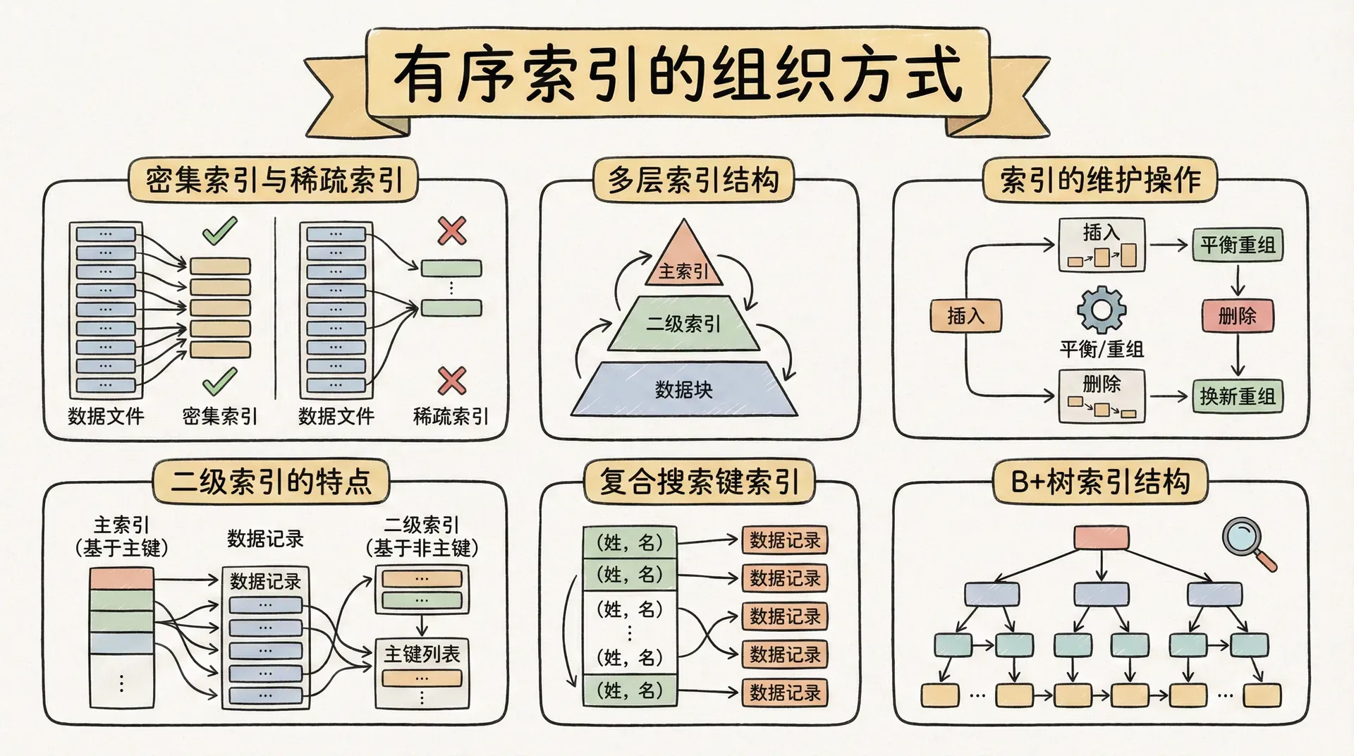 索引和哈希技术是现代数据库系统的核心基础设施,它们让数据检索变得高效而灵活。从有序索引的密集与稀疏方案,到实现极速定位的哈希和可扩展哈希技术,以及在特定场景下效率极高的位图索引,各类索引机制各有优缺点,互为补充,构建起现代数据库系统完整而强大的索引生态。