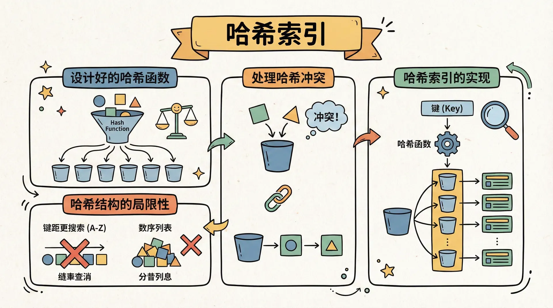 但哈希索引不适合范围查询。要查找ID在10000到20000之间的所有员工,我们无法通过哈希函数直接定位,因为这个范围内的ID可能散布在所有的桶中。此时只能扫描整个哈希表,效率反而比顺序扫描原文件还要低。