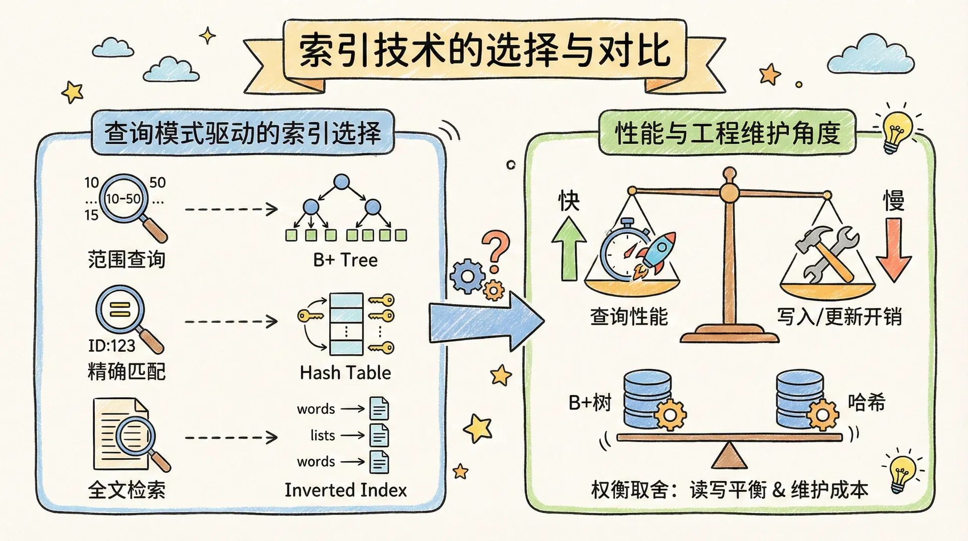 在实际的数据库系统架构设计中,索引方式的选择(如有序索引B+树与哈希索引)对系统整体性能、扩展性和适应场景均有深远影响,所以我们需要从查询模式、性能表现、维护成本等多维度进行严谨权衡。