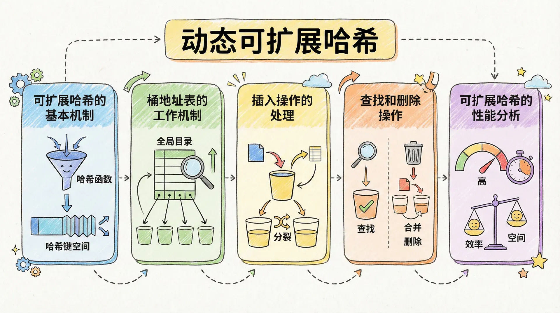 可扩展哈希的核心设计在于:并不为全部可能哈希值预配置存储桶,而是依据实际数据插入情况动态创建桶。同时,引入“桶地址表”(directory)作为中间层,实现哈希值与物理桶的灵活映射。这一级地址表支持实时扩容、缩容,并允许多个哈希前缀映射至同一个物理桶,实现存储结构的按需弹性调整。