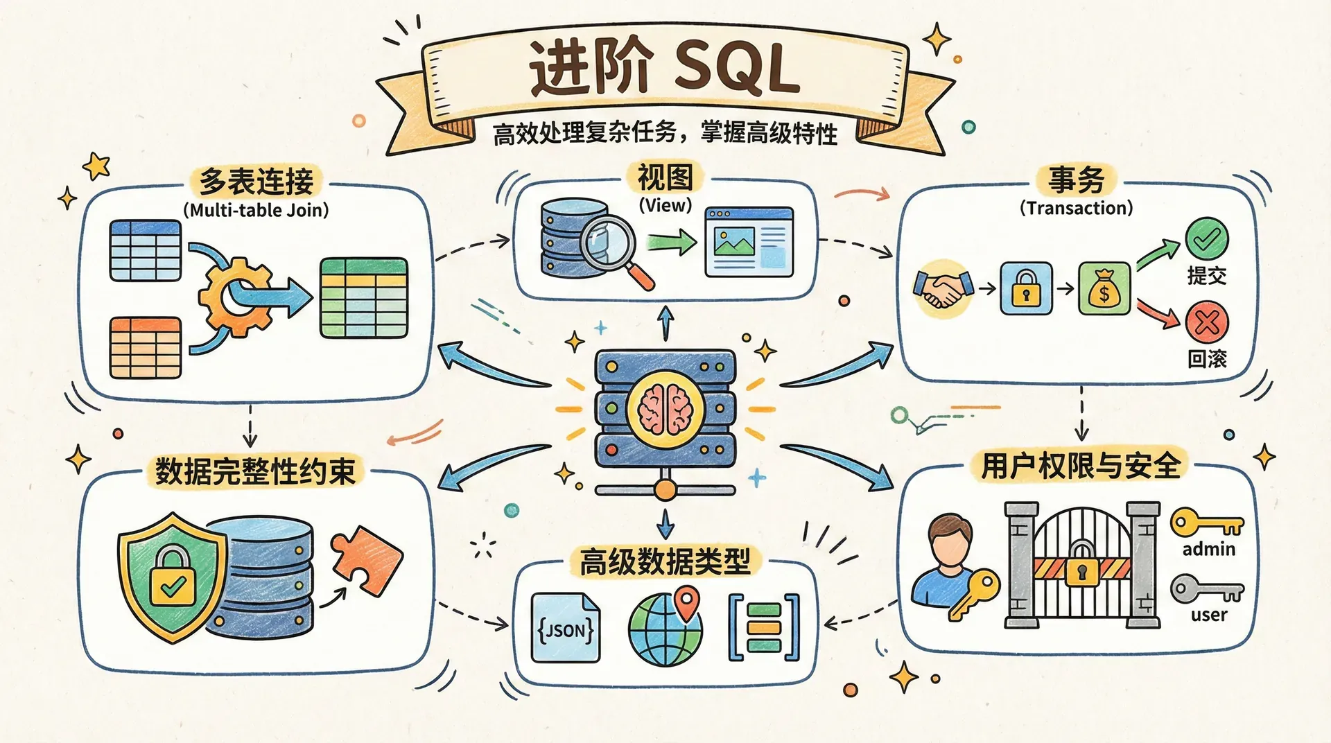 在数据库领域,进阶 SQL 能力使我们能够高效地处理复杂的数据分析、数据管理和安全控制任务。 我们将系统性地介绍 SQL 的高级特性,包括多表连接、视图(View)的设计与应用、事务(Transaction)管理、数据完整性约束、高级数据类型的使用,以及用户权限与安全机制。