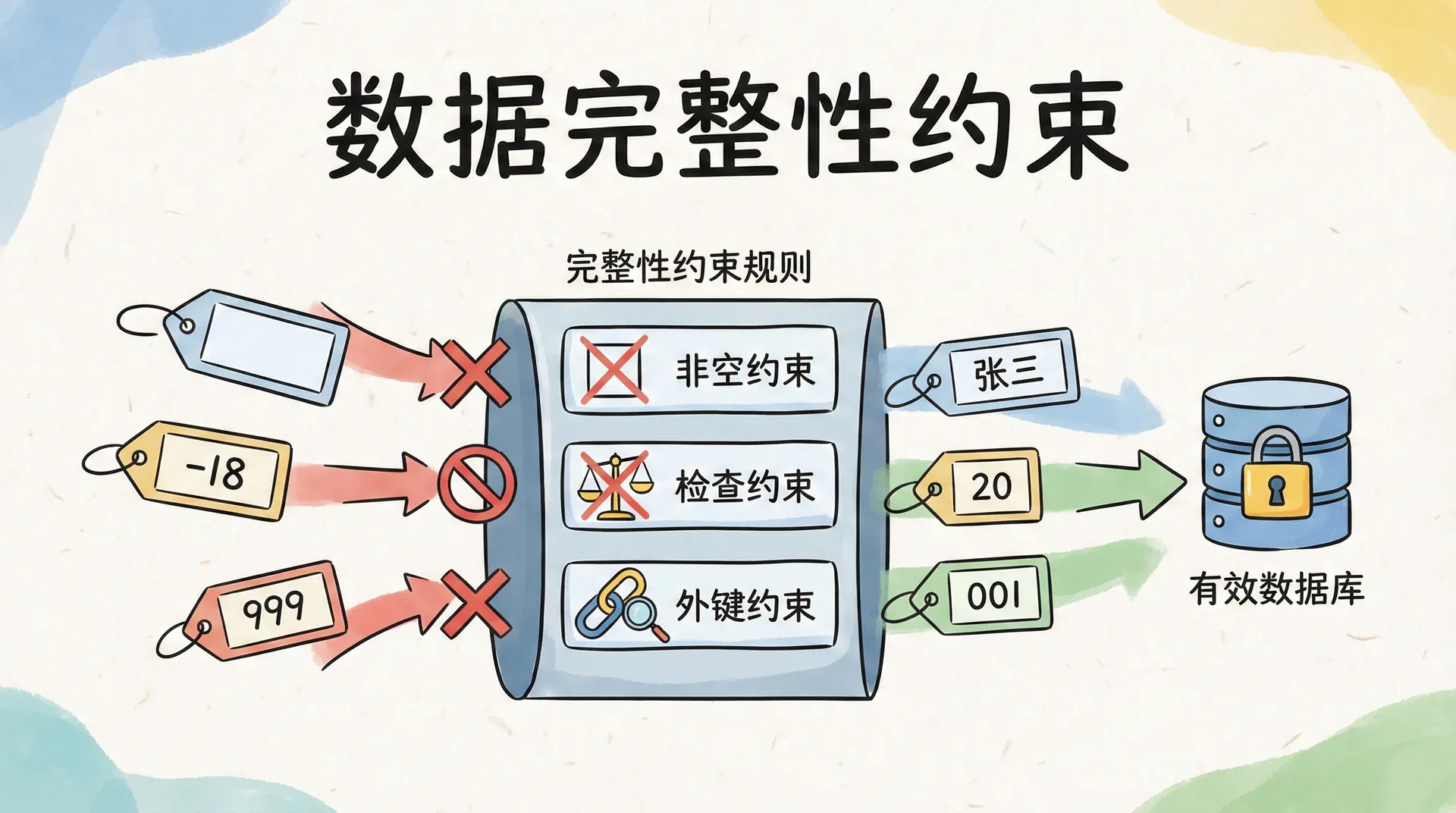 数据完整性约束(Data Integrity Constraints)是数据库系统中用于保证数据准确性、一致性和可靠性的规则集合。它们在表结构设计阶段被定义,强制数据库中存储的数据必须满足特定的业务和逻辑要求。 例如,在学籍管理系统中,数据完整性约束可以防止出现姓名为空、年龄为负数或专业代码不存在等不合理的数据,从而确保数据的有效性和规范性。