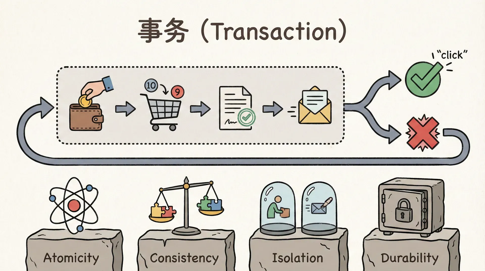 事务(Transaction)是数据库管理系统中用于保证数据一致性和完整性的基本单位。一个事务由一组相关的操作组成,这些操作要么全部成功提交,要么在出现异常时全部撤销回滚,任何中间状态都不会对外可见。 例如你在网上购物,需要完成几个步骤:从账户扣款、减少商品库存、生成订单记录、发送确认邮件。如果在某个步骤出现问题(比如网络断开),你肯定希望要么所有步骤都成功,要么什么都没有发生,而不是钱被扣了但商品没买到。 事务的核心特性通常用ACID(原子性Atomicity、一致性Consistency、隔离性Isolation、持久性Durability)来描述: