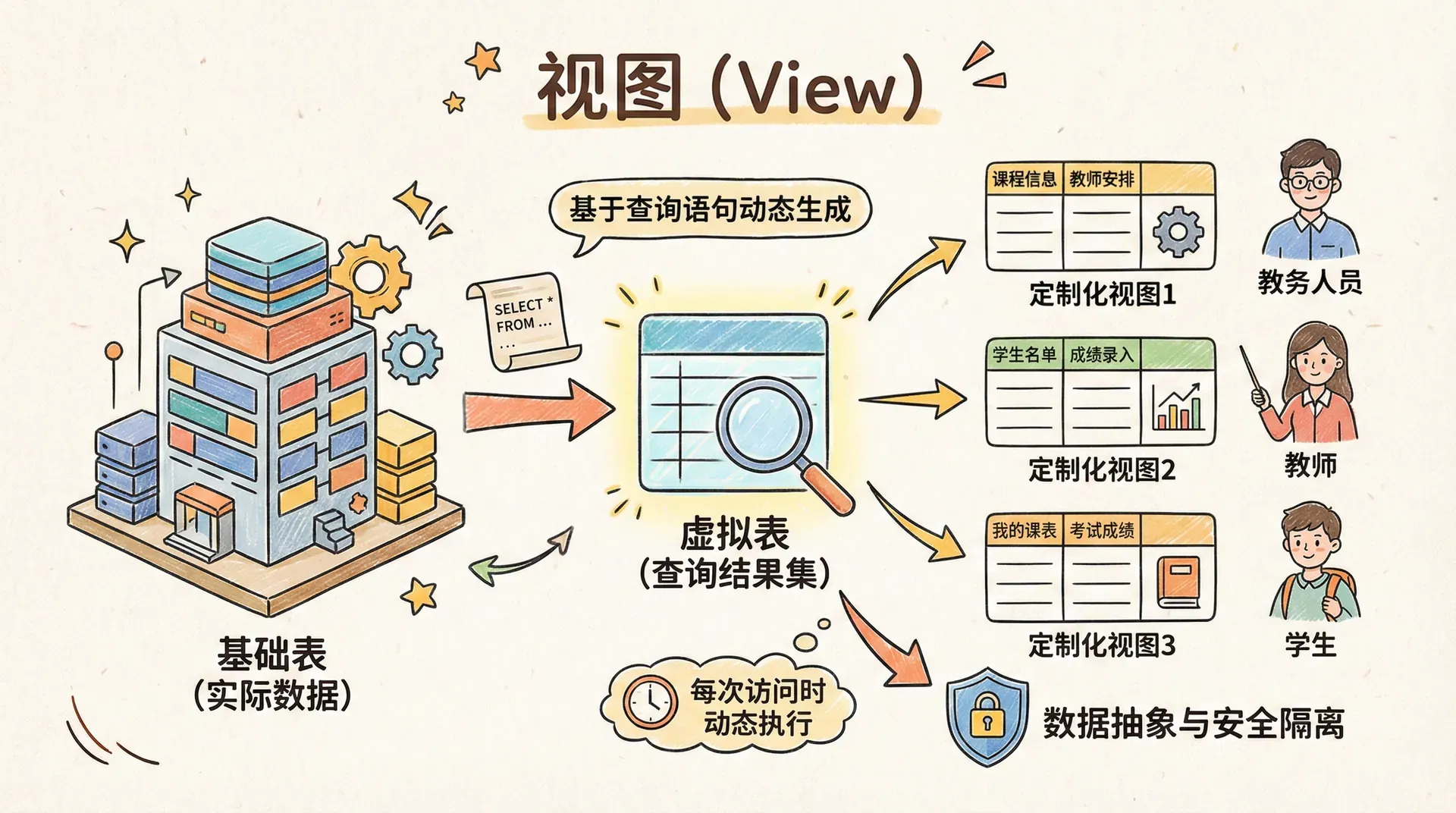 视图(View)是数据库中的一种虚拟表,其本质是基于一个或多个基础表的查询结果集。视图本身不存储实际数据,而是在每次访问时动态地执行定义视图的查询语句,返回相应的数据结果。 通过视图,可以为不同的用户或应用提供定制化的数据展示和访问权限,实现数据抽象和安全隔离。例如,在同一套底层数据基础上,可以为教务人员、教师、学生等不同角色分别定义只包含其所需字段的视图,从而满足多样化的业务需求,同时避免敏感信息的泄露。
