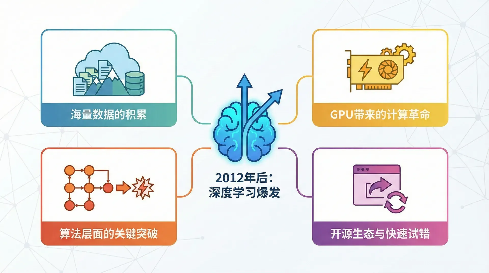 神经网络的理论基础早在1980年代就已经建立,但为什么直到2012年才迎来爆发式发展?这背后有四个关键因素的相互促进。