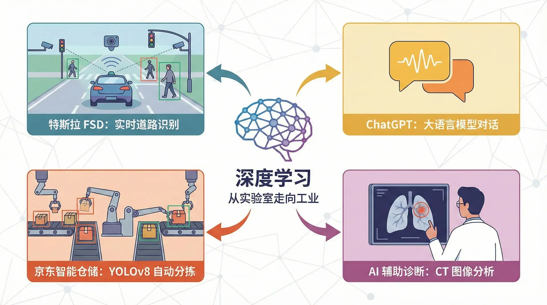 2024年,特斯拉的Full Self-Driving系统每天处理着数百万张道路图像,实时识别行人、车辆和交通标志。同一年,ChatGPT让全球见识了大语言模型的威力,能与人类进行几乎无缝的对话。在中国,京东的智能仓储系统使用YOLOv8每秒分析数千个包裹,自动完成分拣;医院的AI辅助诊断系统通过分析CT扫描图像,帮助医生发现肺部的微小病变。