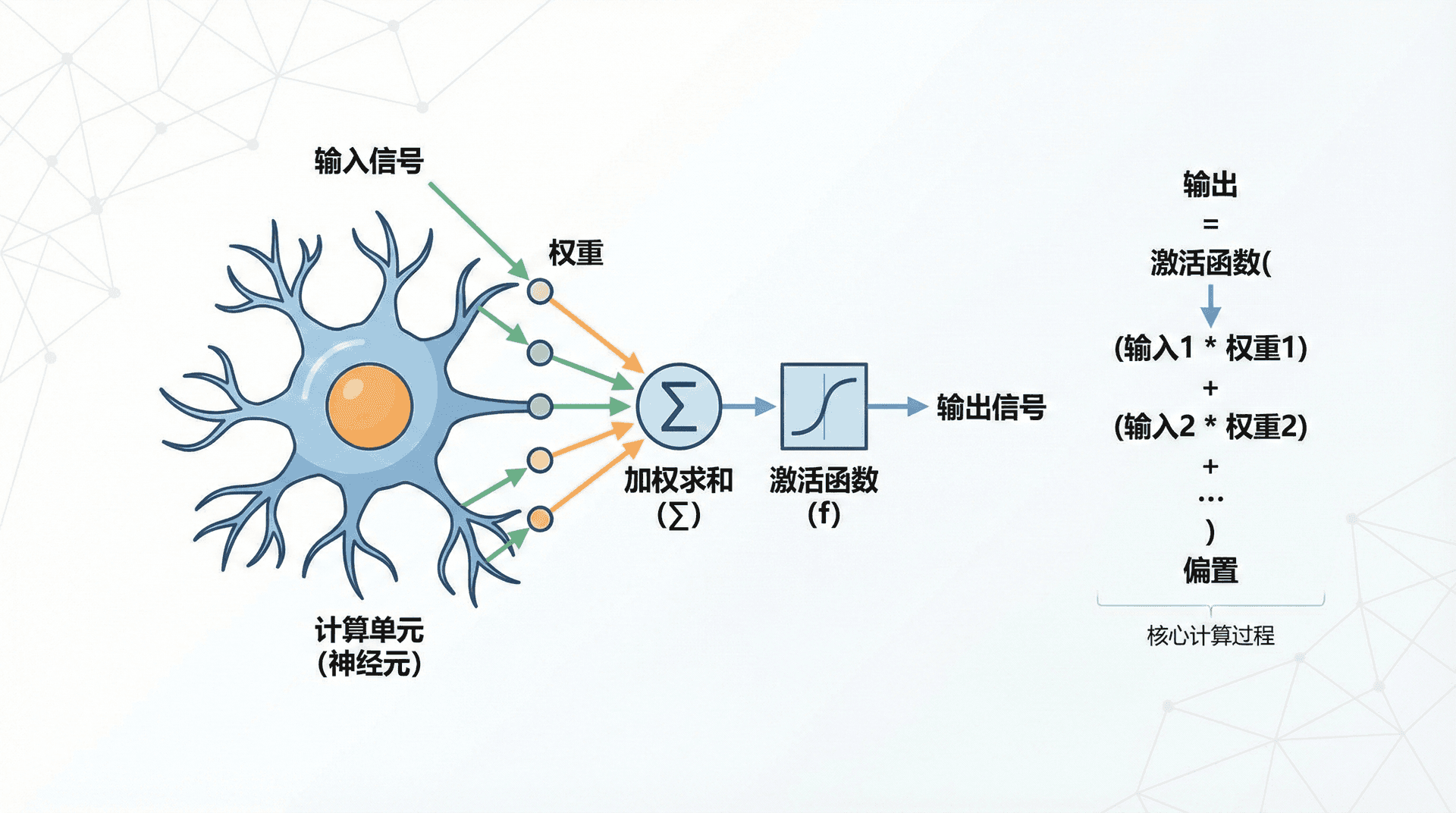 要理解深度学习,我们需要从最基本的构建块开始:神经元。一个神经元的计算过程非常简单,它接收多个输入,对每个输入赋予不同的权重,然后求和并加上一个偏置项: