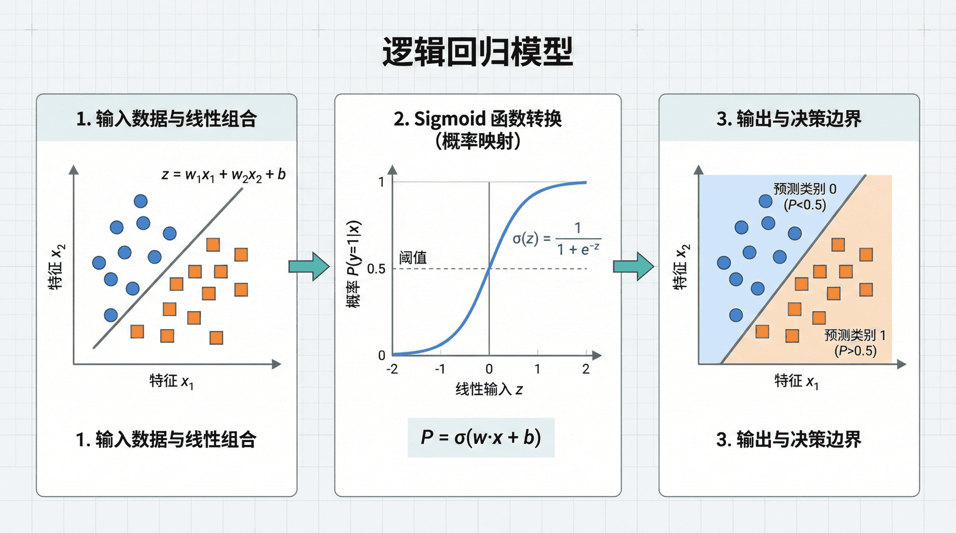 这里 是权重向量, 是偏置项,它们都是需要从数据中学习的参数。 的含义是:给定输入 ,模型预测它属于正类的概率。