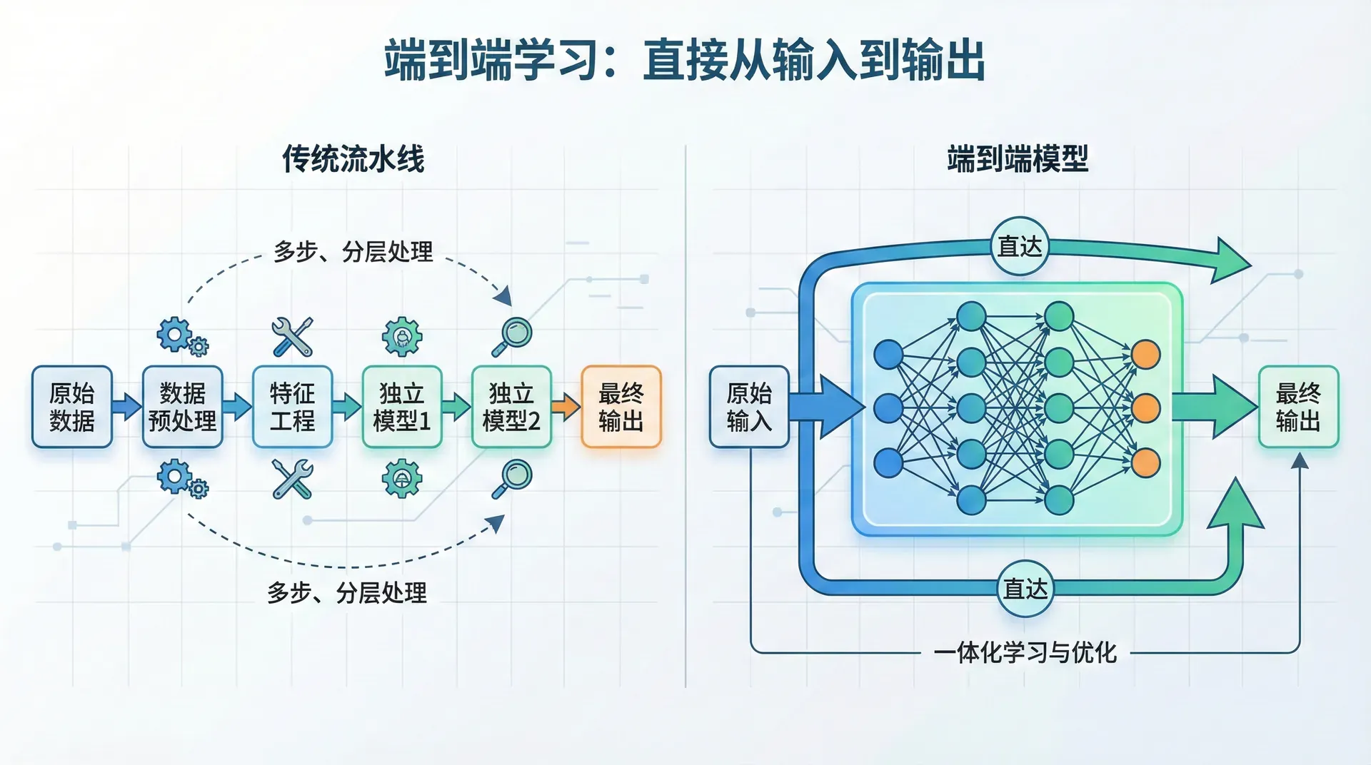 端到端学习体现了深度学习的一个核心理念:让数据驱动,而不是依赖人类专家的规则。但这不是绝对的。有时候人类的先验知识很有价值,强行端到端反而效果差。