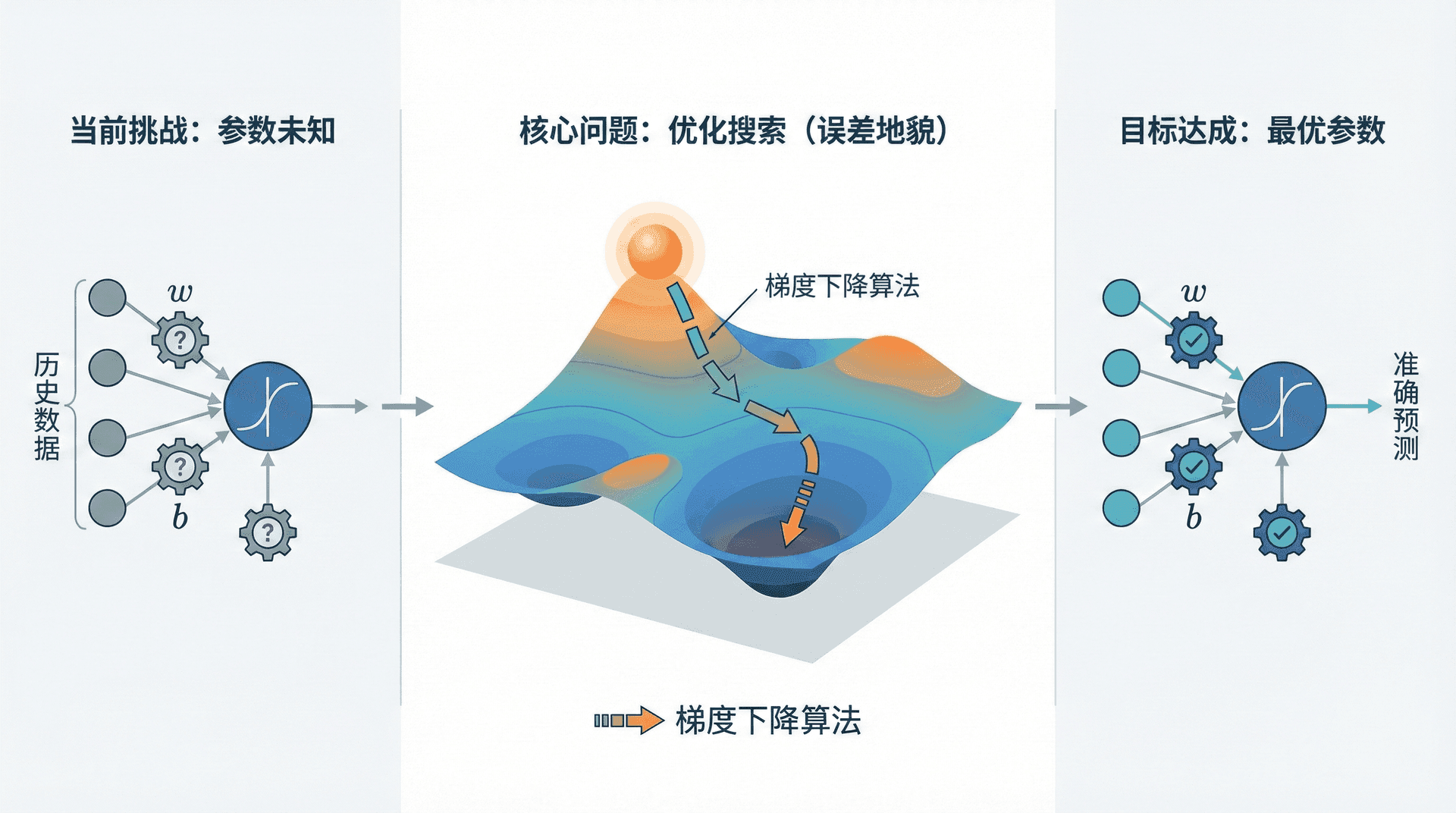 这就是本节要解决的核心问题。我们将看到,训练神经网络本质上是一个优化问题——在海量参数空间中搜索最优解。而梯度下降算法正是解决这个问题的关键工具。