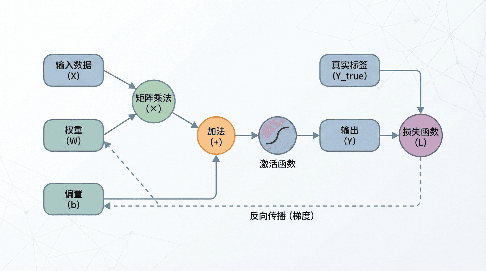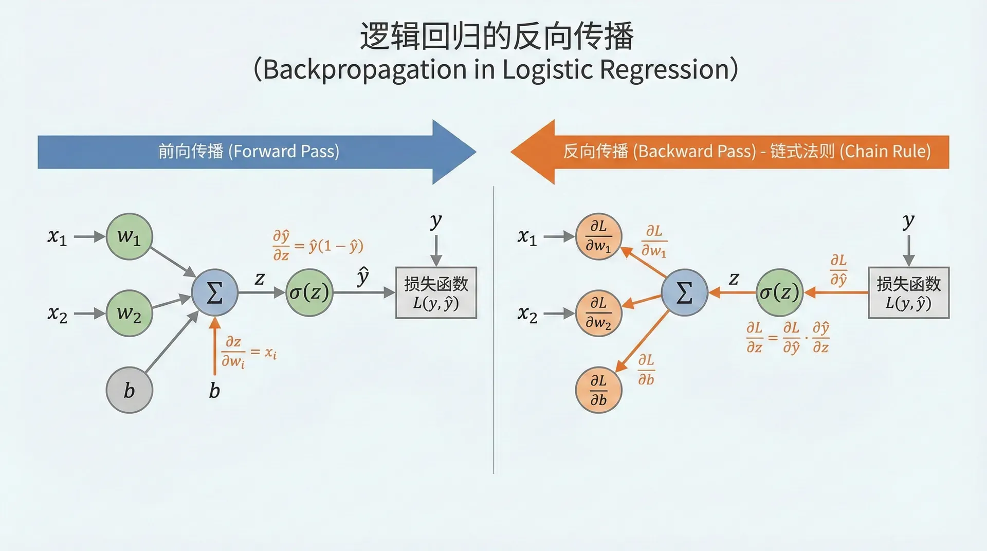 反向传播 (Backpropagation)则沿着图从右到左,计算每个变量对最终输出的梯度。这里用到了微积分中的链式法则 (Chain Rule):