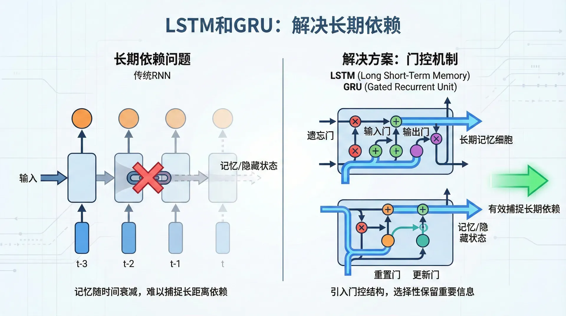 LSTM(Long Short-Term Memory)通过精巧的门控机制解决了梯度消失问题,能记住几十甚至上百步之前的信息。