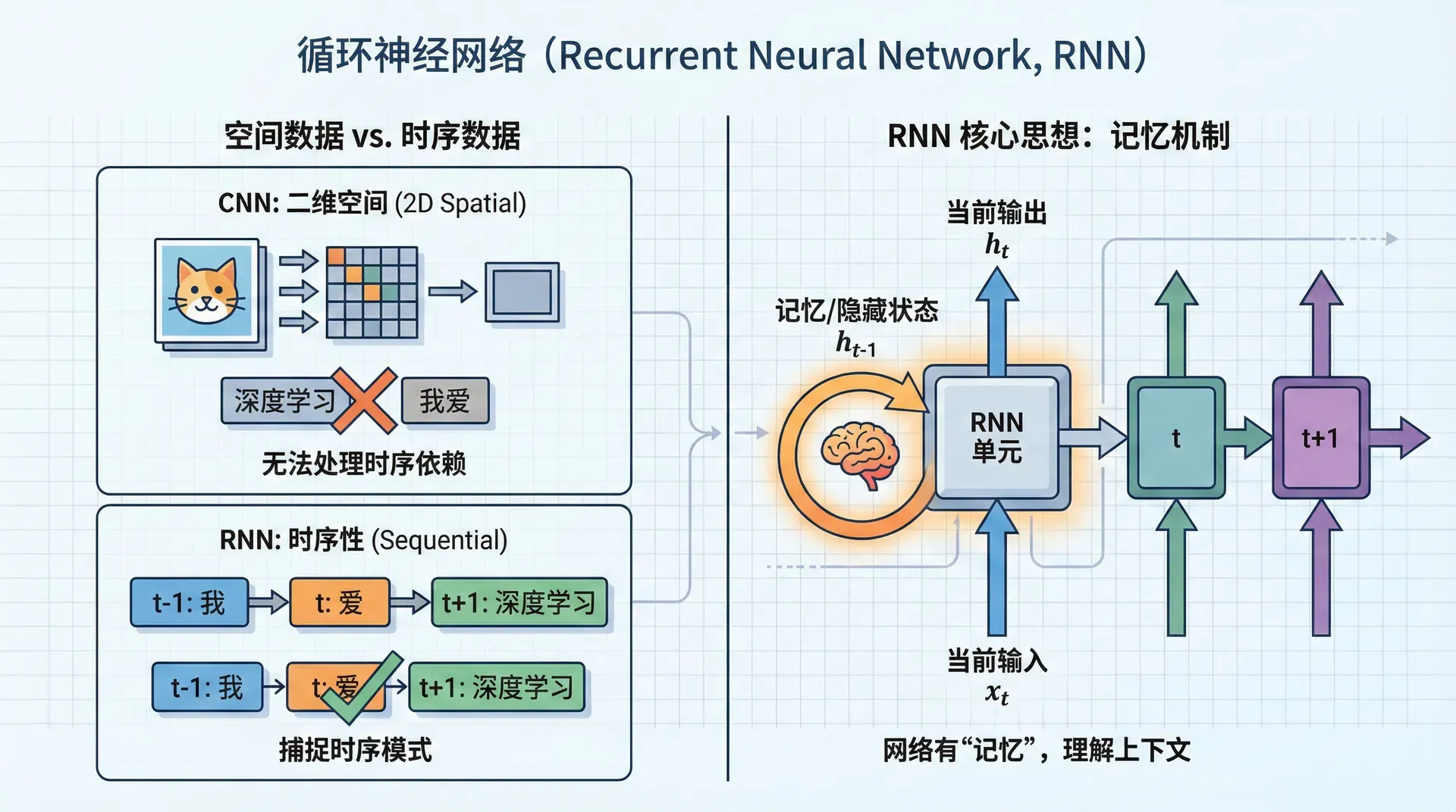 CNN擅长处理图像——二维的空间数据。但语言、音频、股票价格这类数据有不同的特点:时序性。“我爱深度学习”和“深度学习我爱”包含相同的词,但意义完全不同,因为顺序变了。 标准的全连接网络和CNN无法处理这种时序依赖,我们需要新的架构:循环神经网络(Recurrent Neural Network, RNN)。