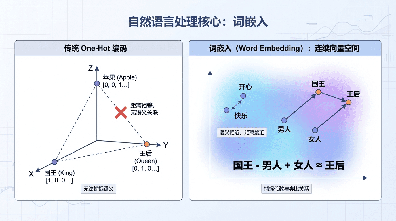 词嵌入 (Word Embedding)改变了这一切。它将词映射到连续的向量空间,语义相近的词在空间中距离接近。更神奇的是,词嵌入能捕捉类比关系:“国王” - “男人” + “女人” ≈ “王后”。这种代数结构让机器能理解语言的细微差别。