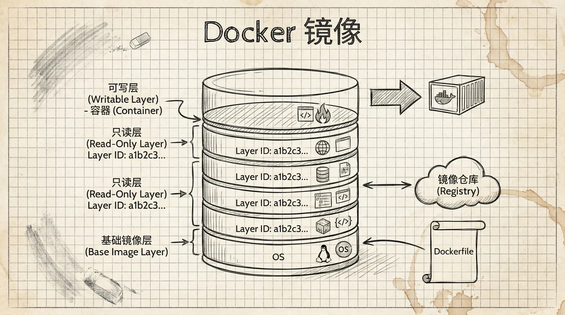 更有趣的是,Docker 镜像并非一个单一的文件,它更像一个“千层饼”或者“洋葱”,由许多层(Layers)堆叠而成。每一层都只包含一部分文件变更。 想象一下你正在制作一个披萨: