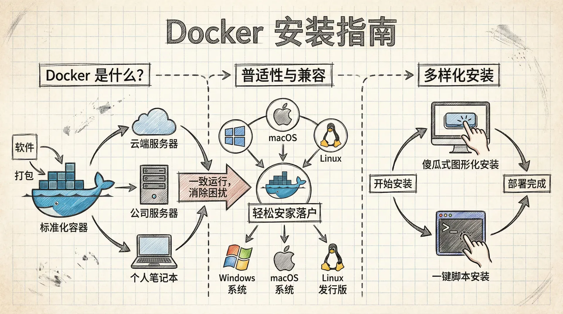Docker 的魅力在于它的普适性。无论你的电脑是 Windows 系统、macOS 系统,还是各种风格的 Linux 发行版,Docker 都能轻松地安家落户。你可以在自己的笔记本上安装,也可以在公司的服务器、甚至云端服务器上部署它。 安装的方式也多种多样,有傻瓜式的图形化安装,也有一键执行的脚本安装。