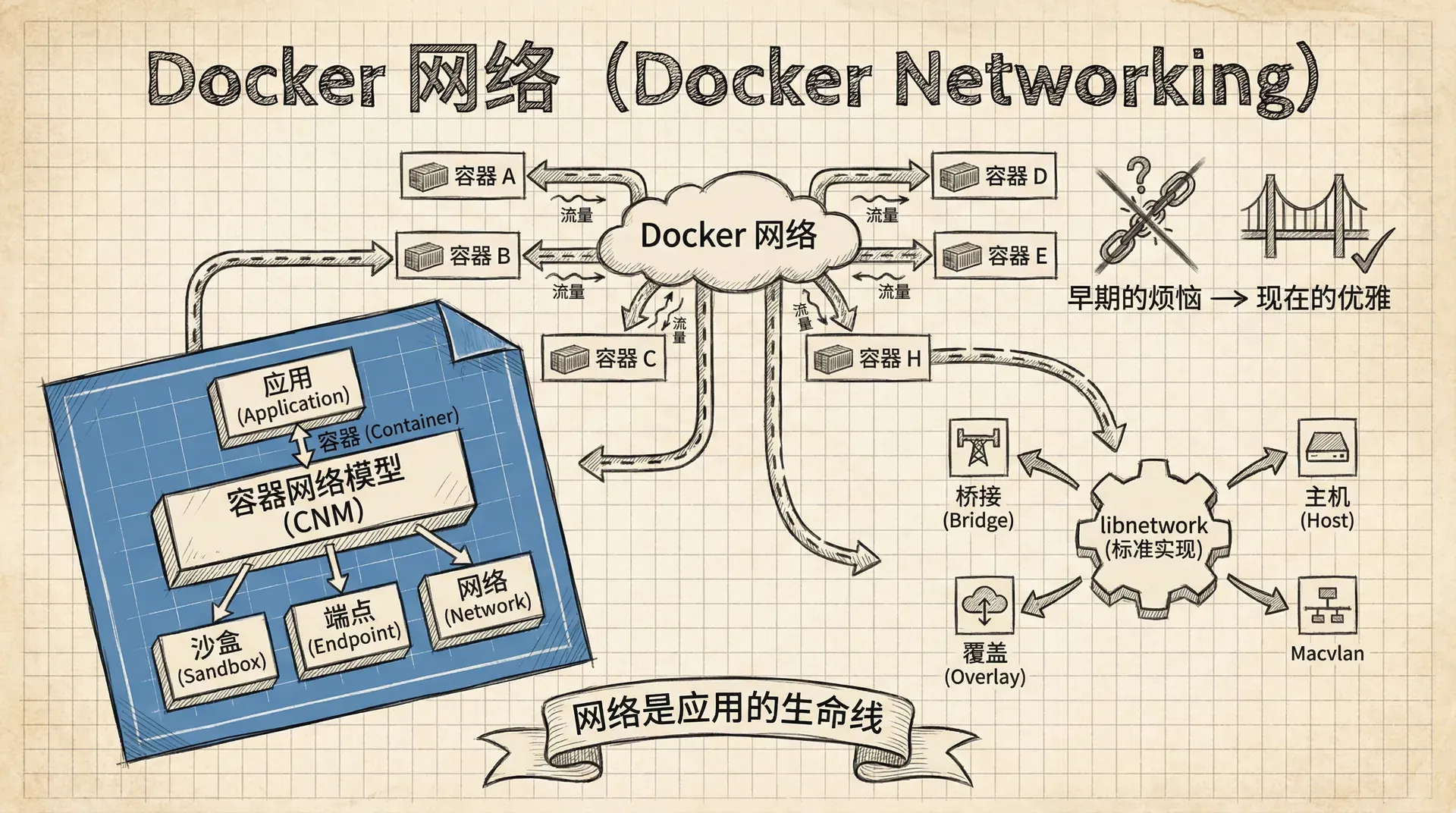幸运的是,Docker 提供了一整套成熟的网络解决方案。无论是容器之间的“局域网”,还是连接外部世界的“高速公路”,Docker 都能轻松应对。这背后,都离不开一个叫做 容器网络模型(CNM) 的基石。